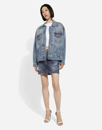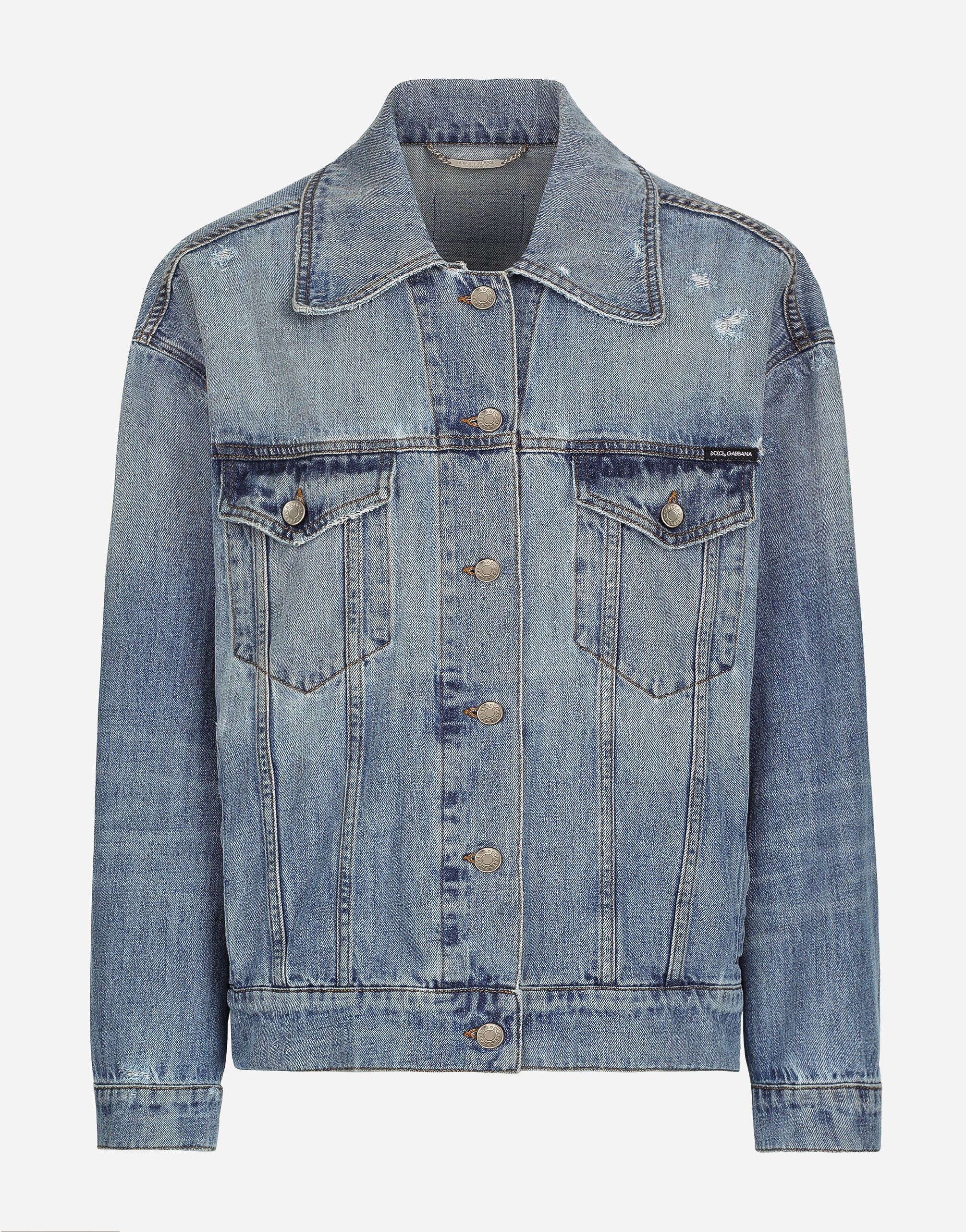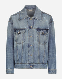 The spirit of the 1960s is taking over the new Flower Power collection. The focus is a head-to-toe floral look built around pairing and layering rose, anemone and floral bouquet maxi-prints. A cosmopolite poised between playful and sexy, this woman interprets the austerity and elegance of the 1960s, harking back to boldly opulent imagery that here at Dolce&Gabbana is condensed and reinterpreted through silhouettes, ample proportions and airy shapes, bringing femininity and sensuality to the forefront. Denim jacket with branded Dolce & Gabbana tag: • Blue • Shirt collar • Long sleeves • Regular fit • Vertical welt pockets • Flap breast pockets with branded metal buttons • Unlined • Branded metal button fastenings • The piece measures 66 cm from the back of the neck on a size IT 40 • The model is 175 cm tall and wears a size IT 40 • Made in Italy External composition: 100% Cotton