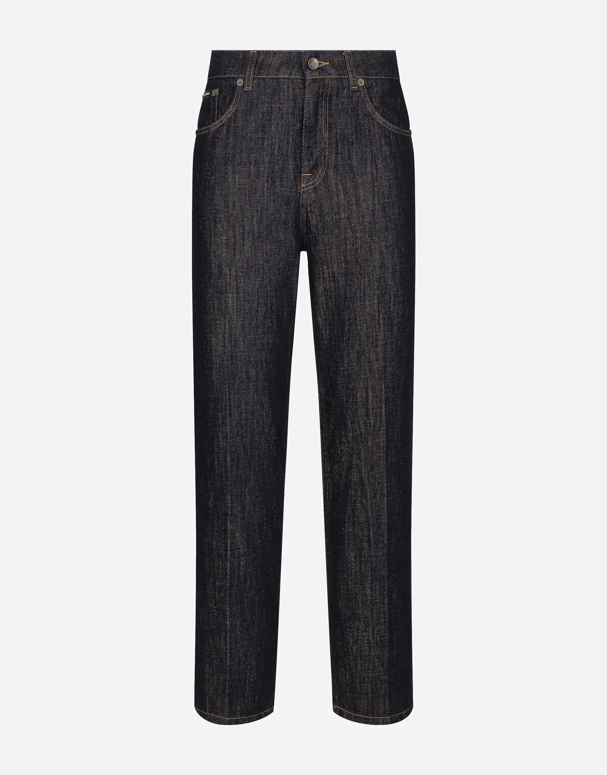 The spirit of the 1960s is taking over the new Flower Power collection. The focus is a head-to-toe floral look built around pairing and layering rose, anemone and floral bouquet maxi-prints. A cosmopolite poised between playful and sexy, this woman interprets the austerity and elegance of the 1960s, harking back to boldly opulent imagery that here at Dolce&Gabbana is condensed and reinterpreted through silhouettes, ample proportions and airy shapes, bringing femininity and sensuality to the forefront. Cotton denim jeans: • Blue • Regular rise • 5 pockets • Branded metal and leather tag • Branded label on the coin pocket • Inner leg: 73 cm • Hem: 18.5 cm • Zipper and branded metal button fastening • The model is 175 cm tall and wears a size IT 40 • Made in Italy External composition: 100% Cotton