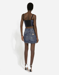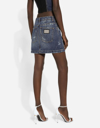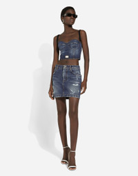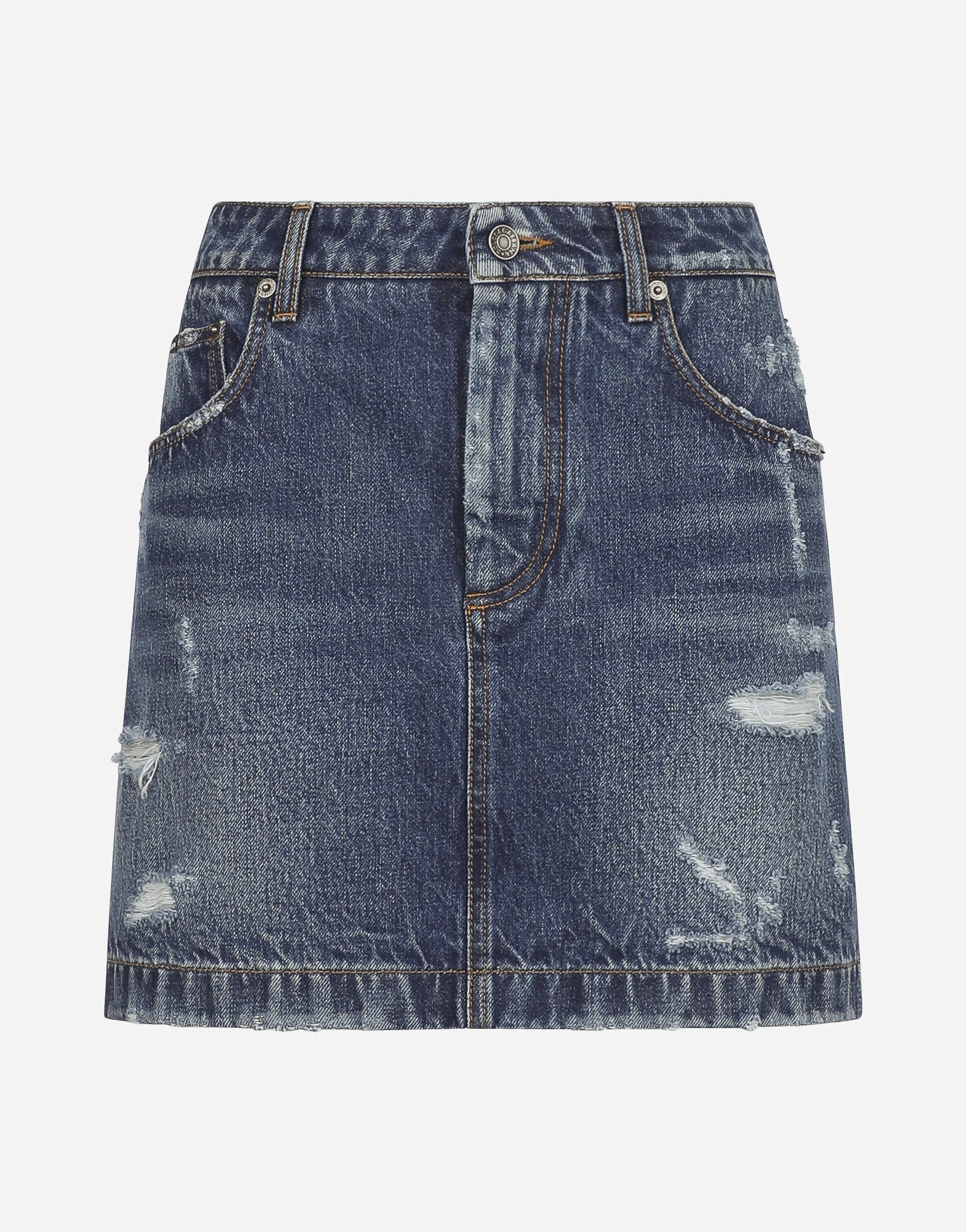 The spirit of the 1960s is taking over the new Flower Power collection. The focus is a head-to-toe floral look built around pairing and layering rose, anemone and floral bouquet maxi-prints. A cosmopolite poised between playful and sexy, this woman interprets the austerity and elegance of the 1960s, harking back to boldly opulent imagery that here at Dolce&Gabbana is condensed and reinterpreted through silhouettes, ample proportions and airy shapes, bringing femininity and sensuality to the forefront. Cotton denim miniskirt with small rips: • Blue • Regular rise • 5 pockets • Unlined • Front zipper fastening and button • The piece measures 40 cm from the waist down on a size IT 40 • The model is 175 cm tall and wears a size IT 40 • Made in Italy External composition: 100% Cotton