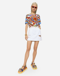 Denim mini skirt with rips: • White • High-waisted • 5 pockets • Branded metal and leather tag • Branded label on the coin pocket • Inner leg: 75 cm • Hem: 15 cm • Zipper and branded metal button fastening • The model is 175 cm tall and wears a size IT 40 • Made in Italy Care And Details External composition: 100% Cotton