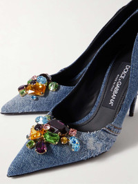 EDITORS'NOTES Dolce & Gabbana's pumps are wrapped in light-blue denim with distressed details at the sides. They rest on slender 100mm stiletto heels and are topped with fluorescent crystals on the pointed toes. Wear yours with relaxed jeans for an alternative double-denim look. SIZE & FIT - Fits large to size, take a half size smaller than normal - Italian sizing DETAILS & CARE - Heel measures approximately 100mm/ 4 inches - Blue denim - Slip on Large to size. See Size & Fit notes.