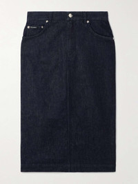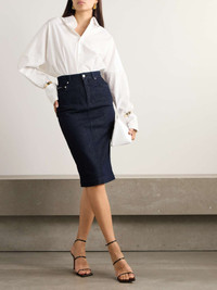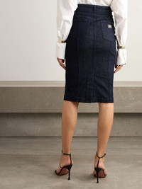 EDITORS'NOTES Dolce&Gabbana's pencil skirt is made from inky stretch-denim that comfortably hugs your figure. It's designed to sit high on the waist and has contouring seams and a back split so you can move with ease. Wear yours with a collared shirt or feminine blouse tucked into the high waist. SIZE & FIT Model measurements: - Fits large to size, take one size smaller than normal - Knee-length, designed to be worn at the waist - Mid-weight, stretchy denim - Model is 175cm/ 5'9" and is wearing an IT 38 - Bust: 78cm/ 31" - Waist: 62cm/ 24.5" - Hip: 92cm/ 36" DETAILS & CARE - Navy stretch-denim - Button and concealed zip fastening at front - 98% cotton, 2% elastane - Machine wash Large to size. See Size & Fit notes.