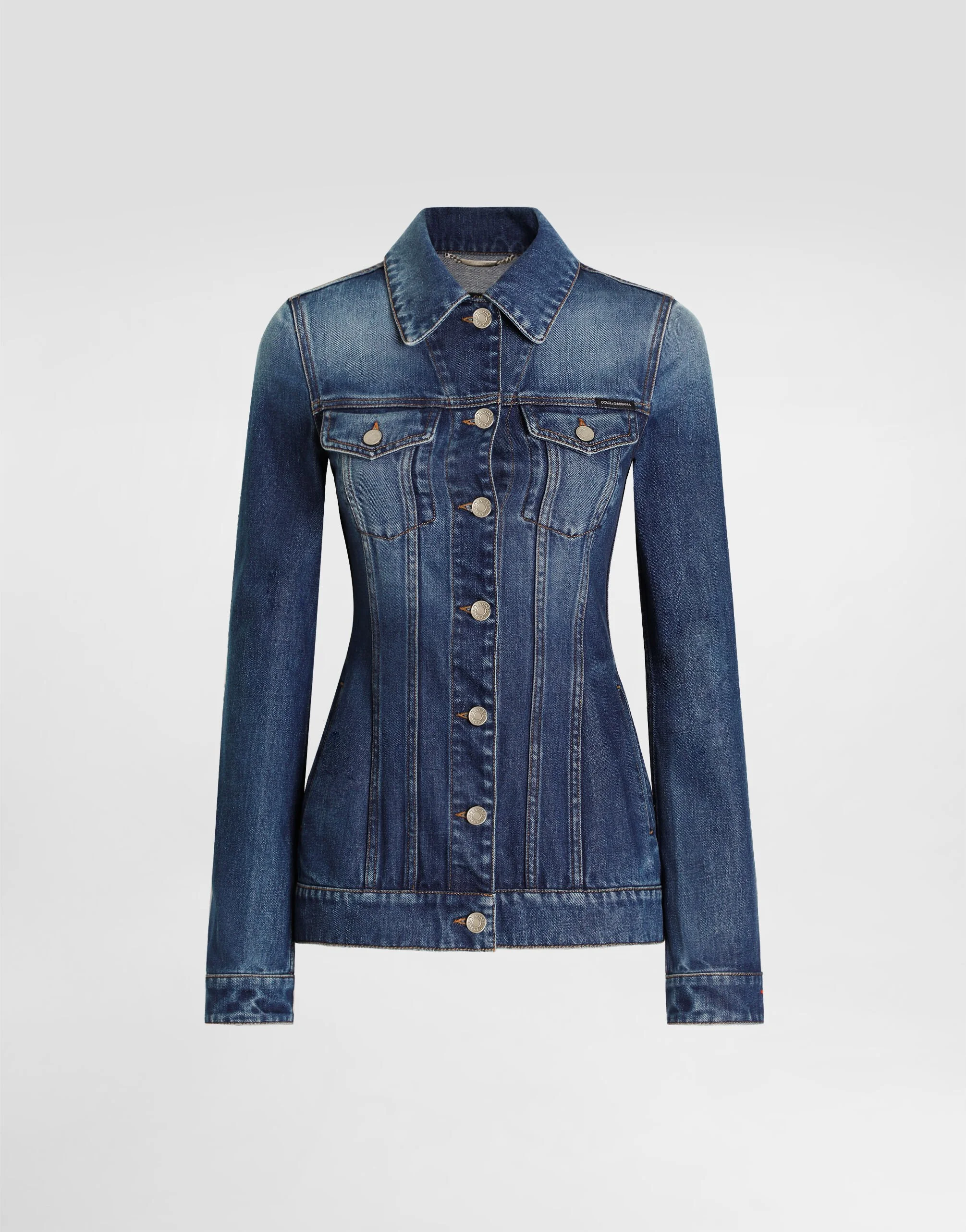 This denim jacket is a versatile and timeless piece that is perfect for adding a touch of casual and modern style to any outfit. Crafted with classic details and a structured silhouette, it's a must-have for any women's wardrobe. Single-breasted denim jacket: • Multi-colored • Dolce shape with protruding sides and classic cuts • Pockets • Vertical welt pocket on the front side • Long sleeves with cuff at the bottom • Unlined • The model is 175 cm tall and wears size 40 IT • Made in Italy External Composition: 100% Cotton