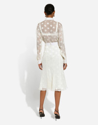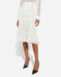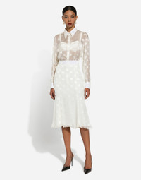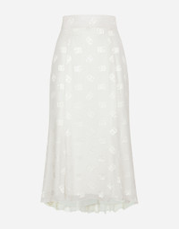 The DNA collection is distinguished by timeless shapes, bringing together three concepts: Sicilian flair, tailoring and sensuality. Nero Sicilia black and optical white predominate and pair with colors that catapult us onto the island of Sicily and make us dream. The designers channel the timeless wardrobe made up of creations that are instantly unmistakable in their simplicity, presenting us with sophisticated beauty loaded with meaning and symbolism that transcends fashion. Dévoré satin godet skirt with all-over DG logo: • White • High-waisted • Stretch silk crepe de chine underskirt • Rear zipper and hook-and-eye fastening • The piece measures 75 cm from the waist down on a size IT 40 • The model is 175 cm tall and wears a size IT 40 • Made in Italy External composition: 51% Silk 43% Viscose 6% Spandex Internal composition: 91% Silk 9% Spandex