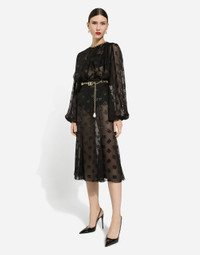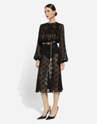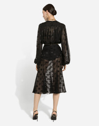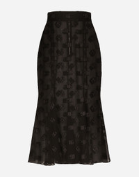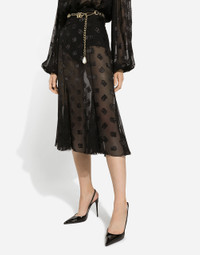 The DNA collection is distinguished by timeless shapes, bringing together three concepts: Sicilian flair, tailoring and sensuality. Nero Sicilia black and optical white predominate and pair with colors that catapult us onto the island of Sicily and make us dream. The designers channel the timeless wardrobe made up of creations that are instantly unmistakable in their simplicity, presenting us with sophisticated beauty loaded with meaning and symbolism that transcends fashion. Dévoré satin godet skirt with all-over DG logo: • Black • High-waisted • Stretch silk crepe de chine underskirt • Rear zipper and hook-and-eye fastening • The piece measures 75 cm from the waist down on a size IT 40 • The model is 175 cm tall and wears a size IT 40 • Made in Italy External composition: 51% Silk 43% Viscose 6% Spandex Internal composition: 91% Silk 9% Spandex