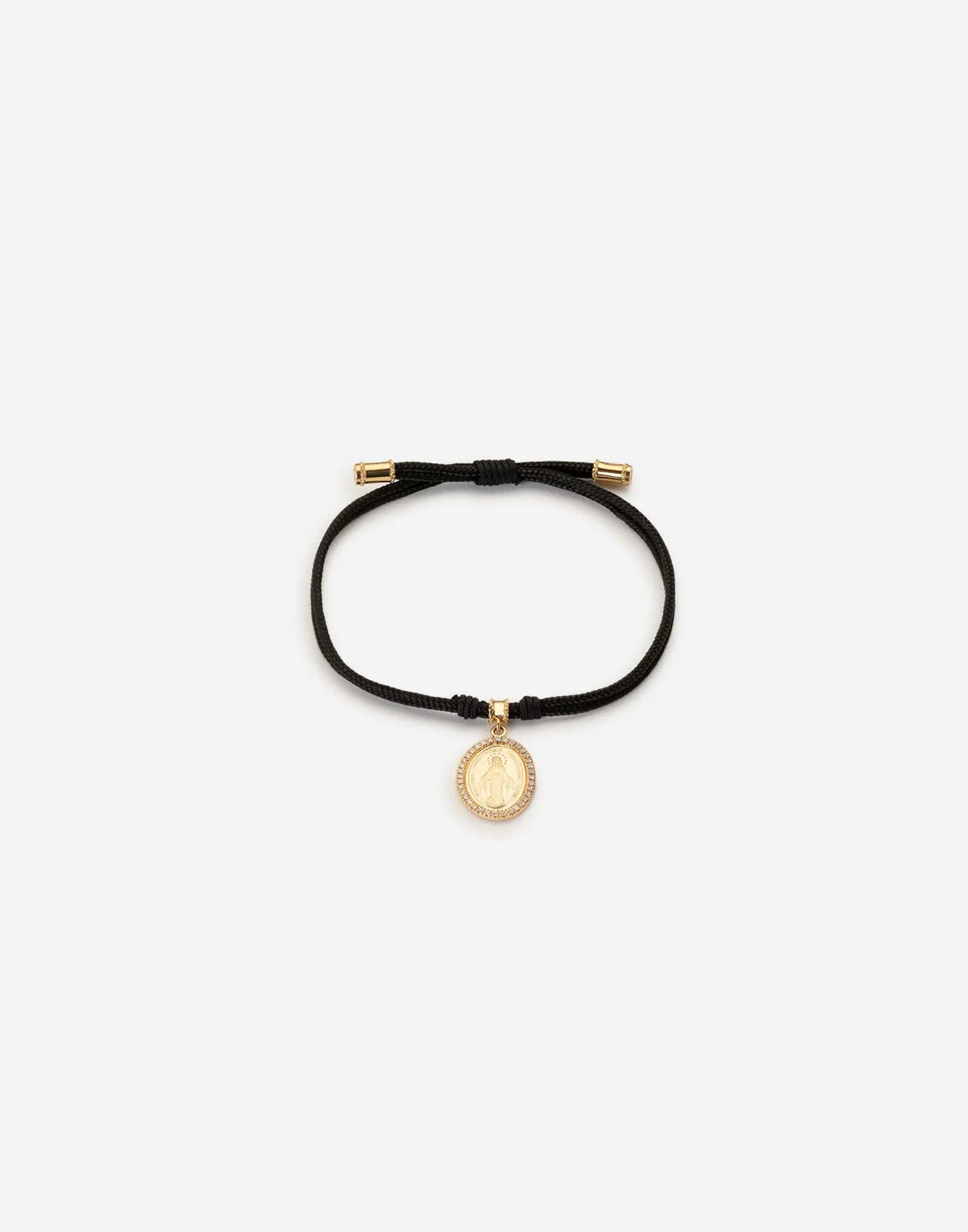 The bracelet consists of an adjustable cord made of hand-knotted fabric and an oval medal depicting the image of the Assumption of the Virgin Mary set in a frame of colorless diamonds in white gold. The composition is enriched by four spacers decorated with twisted wire and two yellow gold terminals on which the logo is displayed on the front. Technical features: Gold 750/000 Gems: 36 round brilliant cut diamonds Black waterproof cord adjustable up to a circumference of 25 cm Made in Italy Yellow and White Gold 750/000