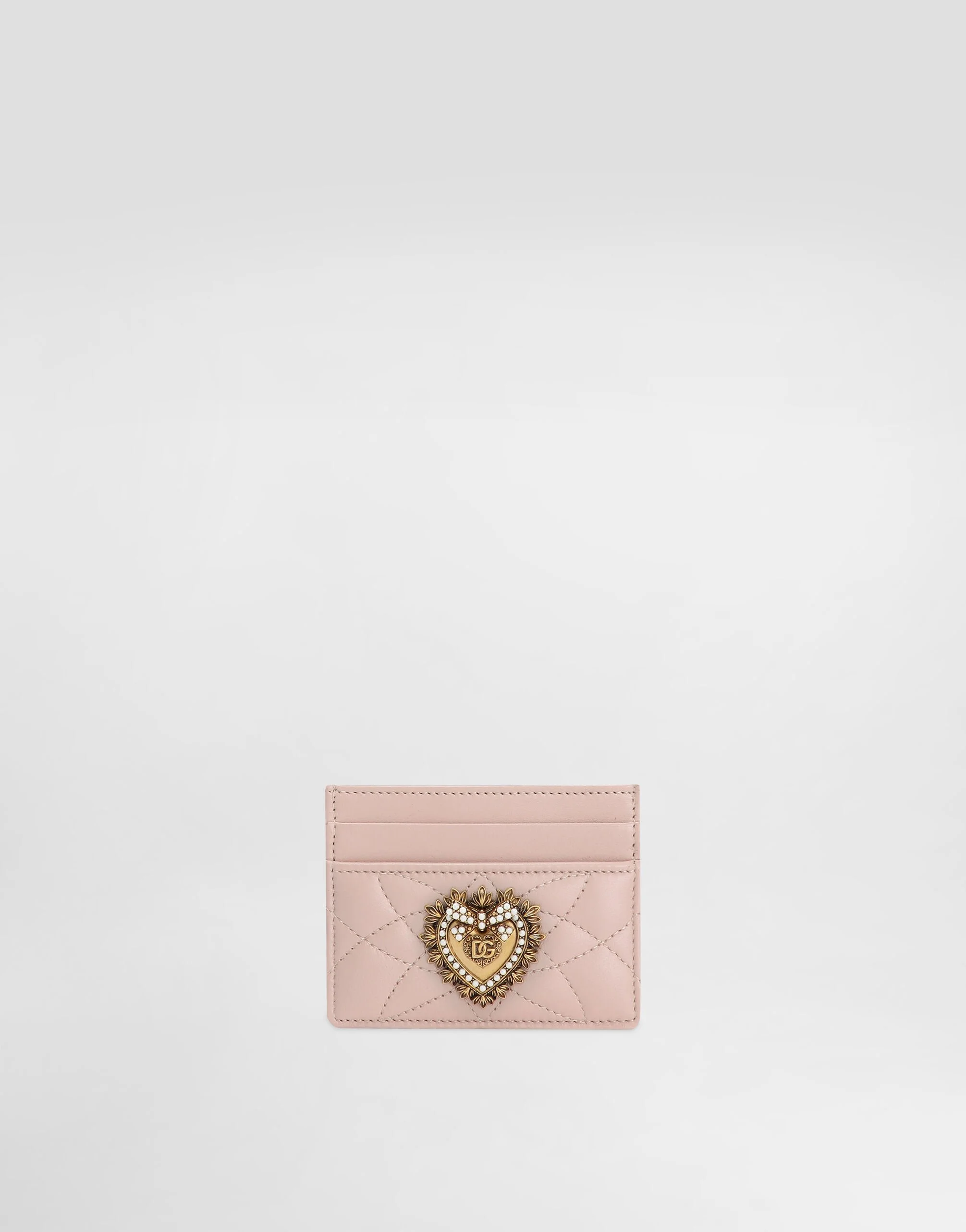 Fine and sophisticated, this Devotion card holder in soft quilted nappa leather features exclusive finishes with the iconic bejeweled branded heart hand-tooled from a metal alloy with pearl inlay: • Four card slots and one on top • Measurements: 10 x 7.5 x 0.5 cm - 3.9 x 3 x 0.2 inches • Made in Italy Care And Details External composition: 100% Lambskin
