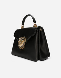 The Devotion line is coming with new details. Made from 100% soft plongé nappa leather, this handbag features a sliding chain and an exclusive bejeweled heart clasp with vintage gold finish. Devotion handbag in plongé nappa leather: • Black • Double-accordion construction • Front flap with bejeweled branded heart made from a metal alloy with pearly ABS inlay • Concealed magnetic fastening • Nappa leather top handle • Adjustable and detachable nappa leather strap • Nappa leather lining, a zipped pocket with Devotion slider and a card slot compartment • Packaging matches the item • Measurements: H25 x W18.5 x D12 cm • Made in Italy External composition: 100% Lambskin Internal composition: 95% Cotton 5% Lambskin