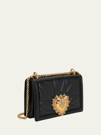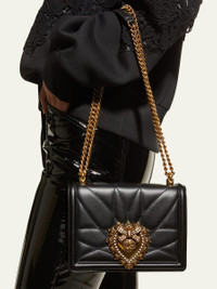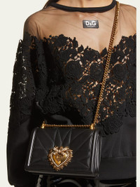 Dolce & Gabbana crossbody bag in quilted lamb leather. Sliding ridged chain shoulder strap; 11.5"-20.5" drop Flap top with hidden snap closure Pearly-beaded sacred heart logo seal in golden hardware. Interior, one zip pocket, and metal Devotion heart medallion. Napa leather lining. 5.7"H x 8.3"W x 1.2"D. Approx. weight: 1.7 lbs. Made in Italy. Online Inquiries: BGS21_V6670| Store Inquiries: #2814206