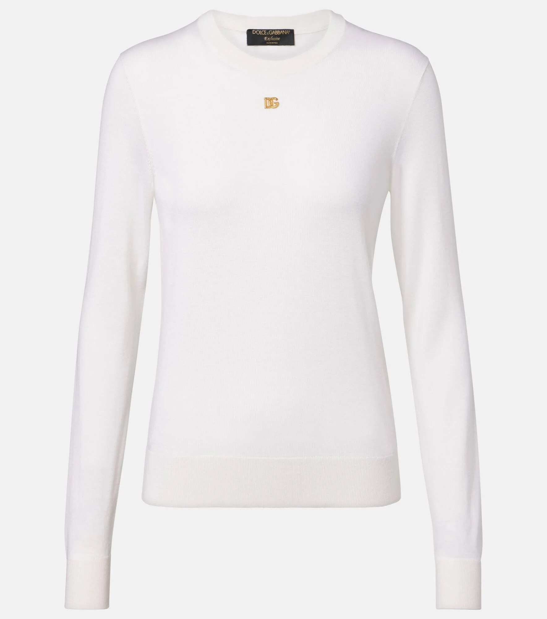 Sicilian culture is on display in Dolce&Gabbana's aesthetic, with bold styles inspired by the brand's Italian heritage. This sweater is spun in Italy from soft cashmere and silk and features signature DG logo hardware and ribbed-knit trims. Product Details - Material: 70% cashmere, 30% silk - Care instructions: dry clean - Made in Italy - Designer color name: Optical White - Item color: white - Collar: crewneck - Cuff: ribbed - Hem: ribbed - Item number: P01106958 Size & Fit - True to size - Semi-sheer - Straight fit - Slightly stretchy fabric - Falls to the hip - The model seen in the picture is 178cm-5'10" and wearing a size IT 40