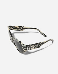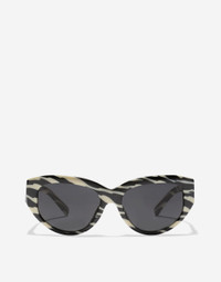 This elegant frame features a gentle cat-eye shape paired with classic temples, enhanced by refined metal accents and the iconic DG crossed logo. Presented in iconic color palette, it perfectly blends feminine allure with sophisticated luxury. •Zebra print acetate frame •Zebra print acetate temples • Dark grey lenses • 100% UV protection • Size bridge - temple - lens: 21- 145 - 43.9 mm • Fitting: Standard • Packaging: Institutional • Made in Italy