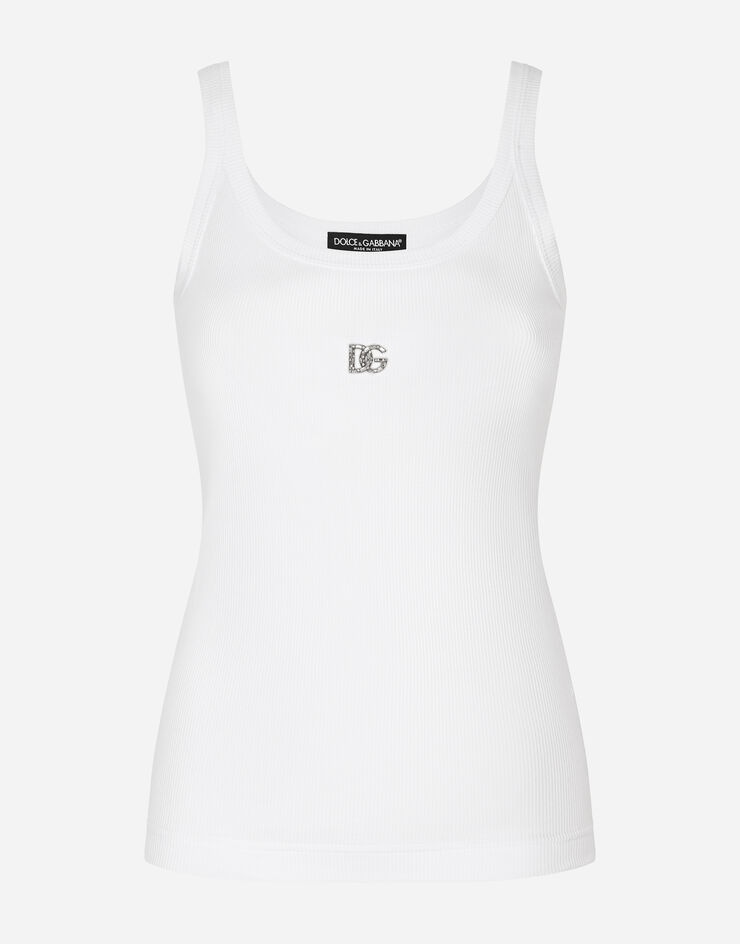 Fine-rib tank top with crystal DG logo: • Plunging neck • Sleeveless with shoulder straps • Form fitting • The piece measures 60.5 cm from the shoulder seam on a size IT 40 • The model is 175 cm tall and wears a size IT 40 • Made in Italy Care And Details External composition: 100% Cotton