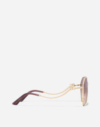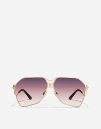 This modern geometric pilot frame combines clean lines with a bold attitude. The iconic DG Crossed logo is elegantly integrated on the front, while the wavy metal temples add a dynamic, architectural touch. • Metal gold frame • Metal gold temples with black terminals • Violet gradient rose lenses • 100% UV protection • Size bridge - temple - lens: 10- 145 - x mm • Fitting: Adjustable nosepads • Packaging: Institutional • Made in Italy