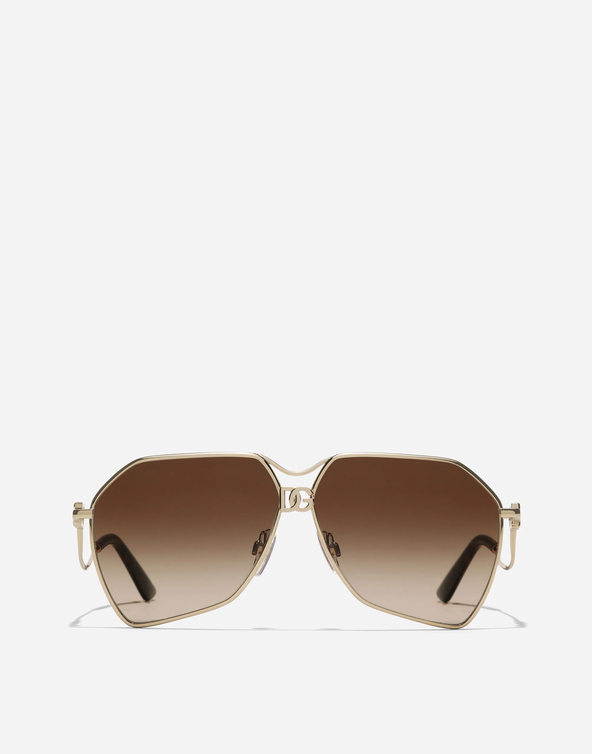 This modern geometric pilot frame combines clean lines with a bold attitude. The iconic DG Crossed logo is elegantly integrated on the front, while the wavy metal temples add a dynamic, architectural touch. • Metal gold frame • Metal gold temples with havana terminals • Gradient brown lenses • 100% UV protection • Size bridge - temple - lens: 10- 145 - x mm • Fitting: Adjustable nosepads • Packaging: Institutional • Made in Italy