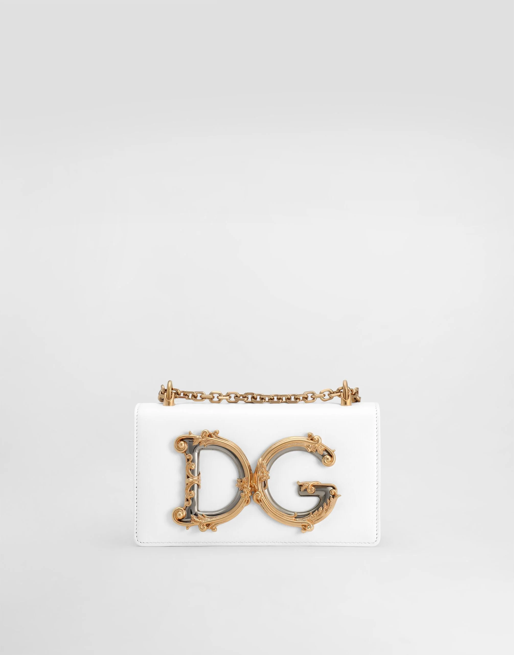 The DG Girls line, designed right down to the smallest detail, has become a phone bag. Understated and elegant, it comes in calfskin with the baroque DG logo on the front in enameled and amber-toned gold-plated ABS: • Adjustable chain strap • Front flap with DG logo • Hidden double magnetic fastenings • Calfskin lining • Item comes with a branded dust bag • Measurements: 10 x 17.8 x 3.5 cm - 3.9 x 7 x 1.4 inches • Made in Italy Care And Details External Composition: 100% Calfskin Internal Composition: 100% Calfskin