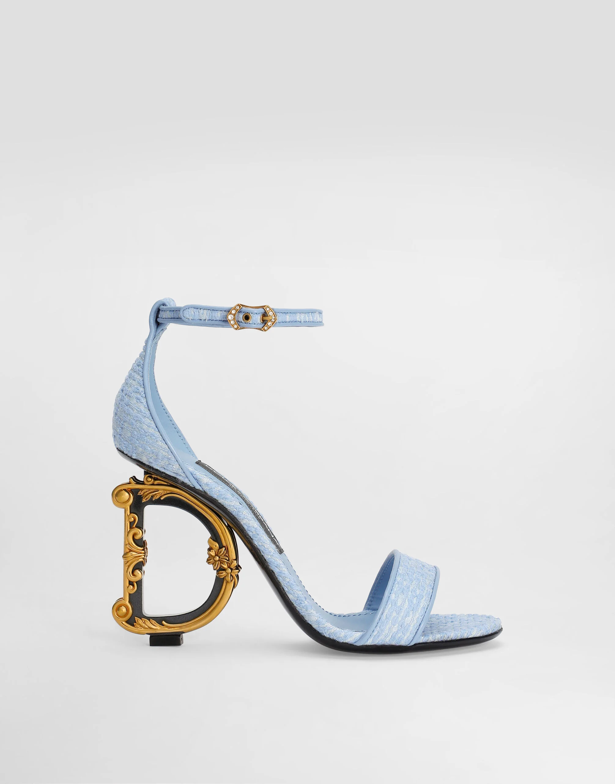 The iconic sandal is coming with new details. Made from boucle fabric, they feature the sculptural baroque DG heel. Boucle fabric sandals with Baroque DG detail: • Light blue • 105-mm heel • Strap with bejeweled buckle • Kidskin insole with branded label • Branded leather sole • Item comes with a branded dust bag • Made in Italy External composition: 62% Lambskin 25% Virgin Wool 11% Viscose 2% Polyamide Internal composition: 76% Goatskin 16% Virgin Wool 7% Viscose 1% Polyamide