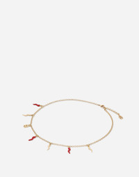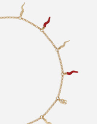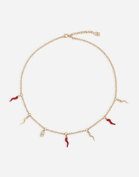 The Italian summers of the 1960s, the candid purity of white, the sophisticated elegance of the jet set of that era. The imagery of the FW24/25 Capri Collection encapsulates all this flawlessly. The pieces range from floaty poplin silhouettes or sack-style dresses and skirts, to brocade outerwear and floral-inlay fabric shirts. The iconic bags – the Logo Bag, the Sicily Bag and the Dolce Box – complement the looks, while the shoes come embroidered with designs inspired by the crystal-clear sea of Capri. Necklace with DG logo and horn charms: • Gold • Red enameled and metal horns • Clasp fastening • Length: 45 + 5 cm • Nickel-free and hypoallergenic materials • Engraved logo • Made in Italy External composition: 90% Brass 10% Enamel