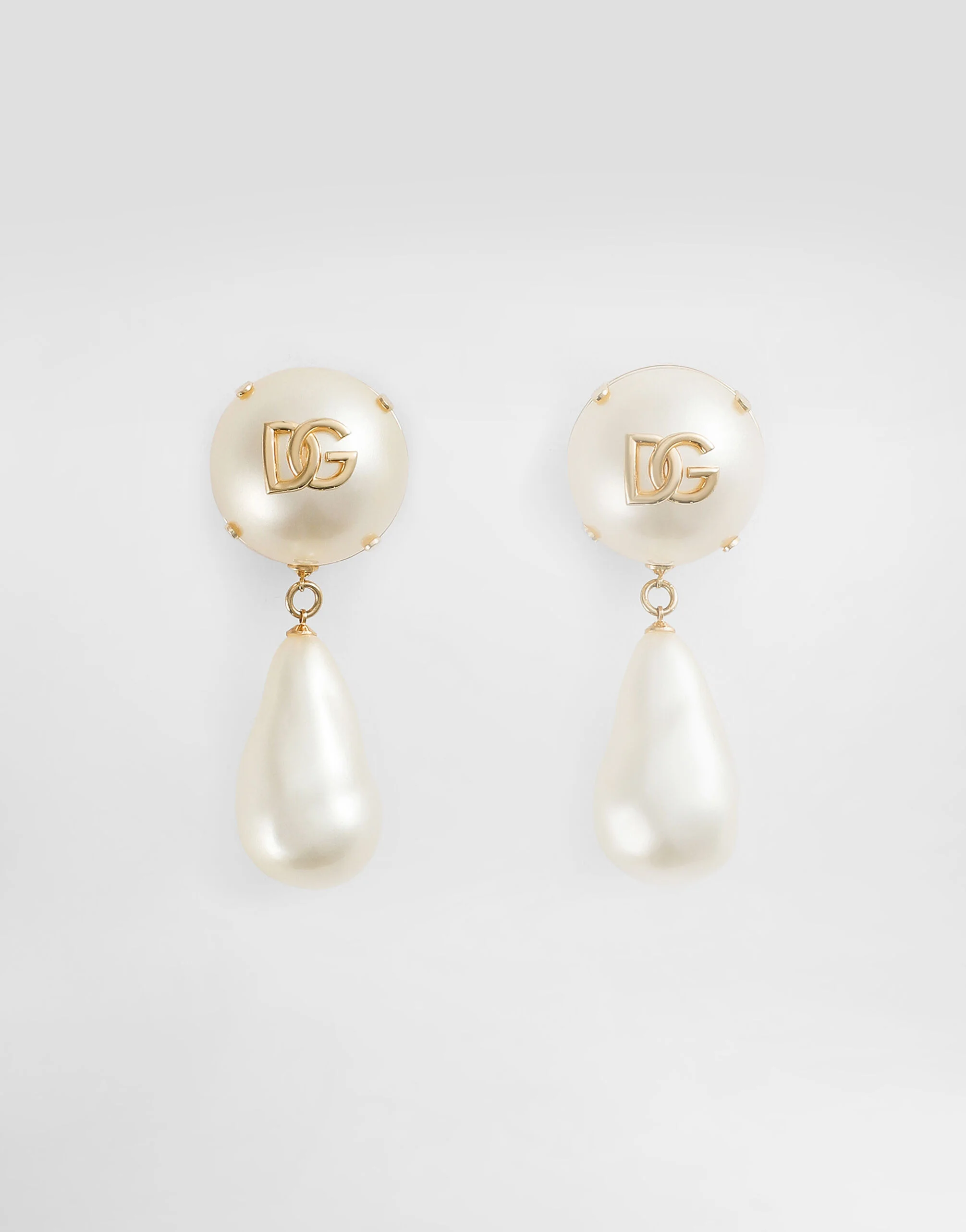 The Everyday Women's Collection reimagines contemporary daily wear with Dolce&Gabbana's signature style codes. Iconic fabrics mix with standout details like embroidered flowers, crystals, and jewel buttons, infusing elegance into every look. Gray animal print accented with green and purple, hyper-geometric jewelry, voluminous shapes and transparencies add unique touches. Men's tweed is reinvented with graphic twists, creating distinctive pieces that reflect refined sensuality. Drop earrings with baroque teardrop accents and acrylic glass cabochons with the DG logo: • White • Height: 8 cm • Width: 3 cm • Clip-on fastening • Nickel-free and hypoallergenic materials • Engraved logo • Made in Italy Composition: 70% Acrylic Glass 30% Brass