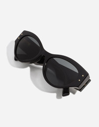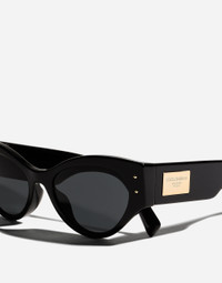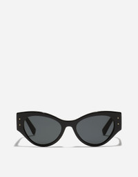 A modern and soft cat-eye shape, the new model in the DG Logo Plaque family, for a contemporary and feminine style.deeply • Black acetate frame • Black acetate temples • Dark grey lenses • 100% UV protection • Size: 53 - 19 - 140 mm • Fitting: Universal • Packaging: Istitutional • Made in Italy