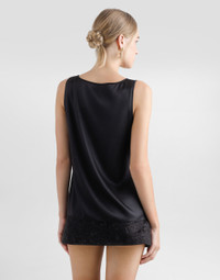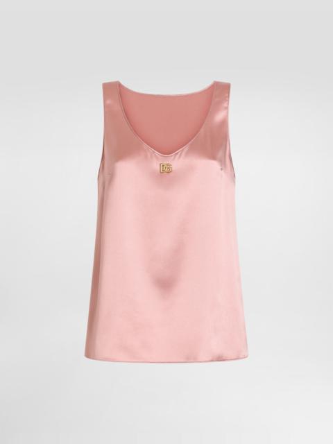 The Women’s DNA Collection is introducing a new side to femininity, which comes in shades of rose quartz, poised between sheerness and opacity, lightness and structure, formality and sensuality. Geometric Dolce Jackets, jacquard pajamas and floral brocade dresses intertwine with ultra-romantic designs. The DG print becomes an iconic statement, while Cordonetto lace and hints of Sicily Black embody the essence of a determined yet romantic femininity. Silk satin tank top with the metal DG logo pin: • Black • Plunging round neck • Sleeveless • Regular fit • The piece measures 57.5 cm from the center back on a size IT 40 • The model is 175 cm tall and wears a size IT 40 • Made in Italy External composition: 93% Silk 07% Spandex