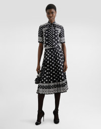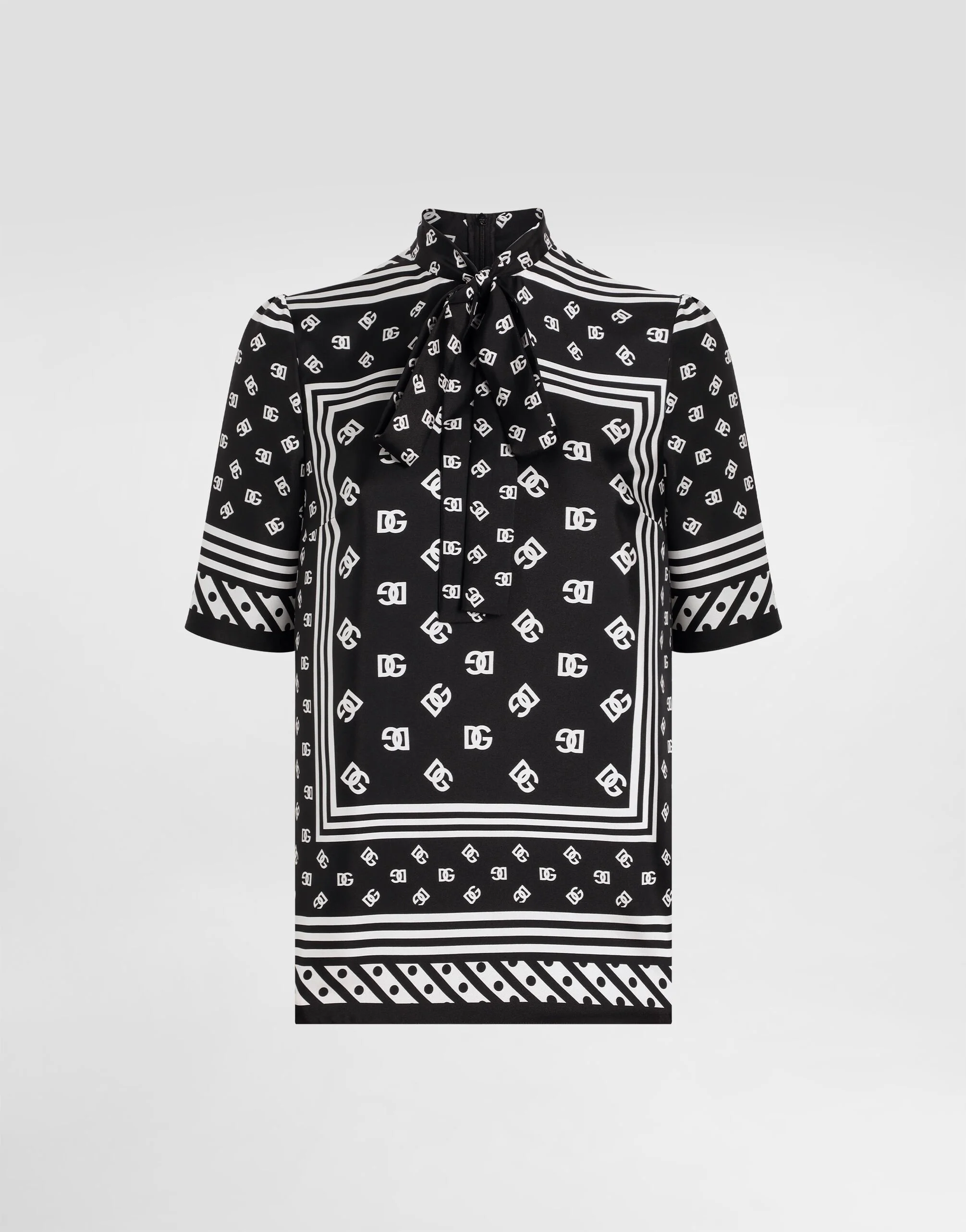 The Women’s DNA Collection is introducing a new side to femininity, which comes in shades of rose quartz, poised between sheerness and opacity, lightness and structure, formality and sensuality. Geometric Dolce Jackets, jacquard pajamas and floral brocade dresses intertwine with ultra-romantic designs. The DG print becomes an iconic statement, while Cordonetto lace and hints of Sicily Black embody the essence of a determined yet romantic femininity. Short-sleeved silk satin blouse with pussy-bow and all-over DG logo scarf print: • Black • Round-neck with pussy-bow • Short sleeves • Regular fit • Zipper on center back • The piece measures 65 cm from the center back on a size IT 40 • The model is 175 cm tall and wears a size IT 40 • Made in Italy External composition: 100% Silk