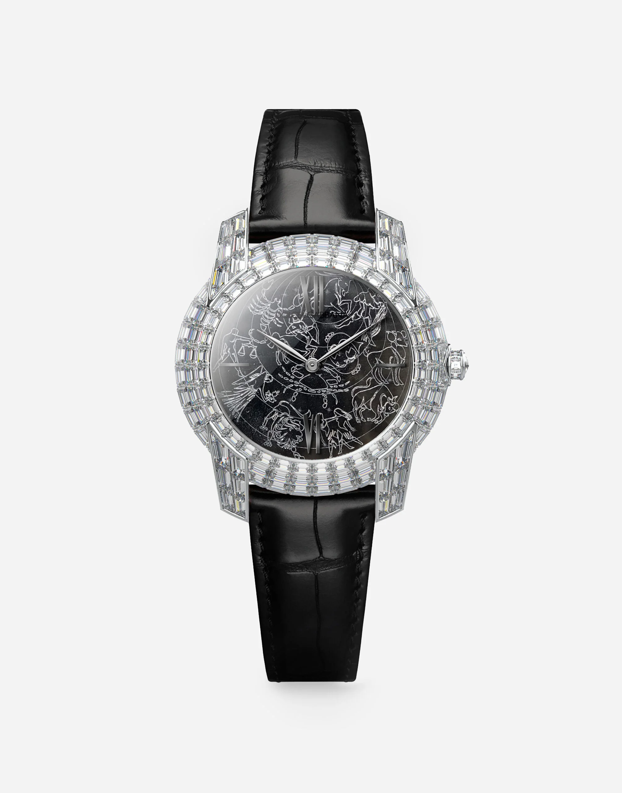 DG7 Invisible Setting watch in 18-carat white gold with alligator strap KOSMOS WATCH Movement Movement DG 01.01, automatic caliber with classic escapement Automatic – self-winding Power reserve: 58 hours (tolerance 0/-3 hours) Frequency: 21,600 vibrations per hour (3 Hz) General information Integration’s diameter: 30.00 mm Total diameter: 30.50 mm Movement height without aiguillage: 4.00 mm Movement height with aiguillage: 6.30 mm Number of components: 209 Number of jewels: 30 Technical specifications Constant force M0: 380 g*mm Barrel wheel total revolution: 12.2 revolution Barrel wheel revolution per hour: 5.15 revolution Mainspring type: slipping bridle Spiral type: flat spiral Balance wheel type: balance wheel with gold micro mass weights, variable inertia Crown wheel: 15 teeth Balance wheel inertia: 10.00 mg.cm2 Lift angle: 46° Caliber weight: 14.70 grams Rotor material: sintered tungsten carbide metal Rotor weight: 2.70 grams Case 224 colorless diamonds, rectangular and trapezoidal shape, baguette cut: 17.41 ct color range: D–F; clarity range: flawless–VVS Dial 1 black sapphire, round shape, flat cut: 15.20 ct Crown 10 colorless diamonds, square shape, baguette cut: 0.17 ct color range: D–F; clarity range: flawless–VVS 1 colorless diamond, round shape, rose cut: 0.13 ct color range: D–F; clarity range: flawless–VVS Deployant clasp 68 colorless diamonds, rectangular shape, baguette cut: 2.34 ct color range: D–F; clarity range: flawless–VVS Strap Black alligator 18 kt white gold POST-SALE WATCH MAINTENANCE To maintain the brilliance of the watch and metal bracelet, we recommend using mild soap and rinsing thoroughly with warm water. Dry with a soft cloth. We recommend this being done also after a swim in the sea or pool. It is advisable to avoid direct contact with solvents, detergents, perfumes and cosmetic products, which might damage the case, seals, bracelet and/or strap. It is advisable to protect the watch from falls and shocks, which could not only seriously damage the finish, but might affect the mechanical functions also, as well as the water resistance and accuracy of the watch. After adjustments, it is recommended to always push the crown firmly against the case to prevent water or dust from entering the mechanism. The watch is water resistant up to 3?BAR / 3?ATM. This means it has been tested under underwater pressure equivalent to a depth of 20 meters. The watch should never be used for sports involving a high risk of impact (such as surfing, water skiing, etc.). Leather straps are not suitable for activities involving water. When the watch is wet, do not pull out the crown, as water could enter the case. Temperatures above 60°C/140°F and below -10°C/14°F , sudden changes in pressure, density and temperature, magnetic fields, and many other factors can affect the accuracy of the watch, we recommended to avoid placing the watch next to objects which could generate strong magnetic fields, such as loudspeakers and electric motors. If you note any irregularities in operation, the watch should be taken to an authorised Dolce&Gabbana retailer.