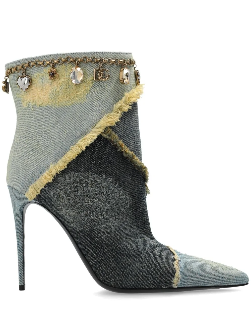 distressed denim boots Highlights - Blue - Denim - Panelled design - Crystal embellishment - Gold-tone logo plaque - Ankle-length - High stiletto heel Made in Italy Composition Cotton 100% SIZE & FIT Measurement HEEL 4.33 in(11 cm)