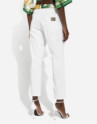 The Flowering Collection has us dreaming of faraway destinations, the most exclusive ones in the world, inviting us through the colors and the yellow rose print to take refuge in warm and unique places. Light White, lemon yellow, polka-dot accents and the various shades of leaf green for vibrant and ultra-feminine pieces where the keyword is tailoring. Every look invites us to savor and dream every moment of our free time, to discover beauty and enhance our femininity. Cotton denim jeans with rips: • White • Low rise • 5 pockets • Branded metal and leather tag • Branded label on the coin pocket • Inner leg: 75 cm • Hem: 18 cm • Zipper and branded metal button fastening • The model is 175 cm tall and wears a size IT 40 • Made in Italy External composition: 97% Cotton 3% Spandex