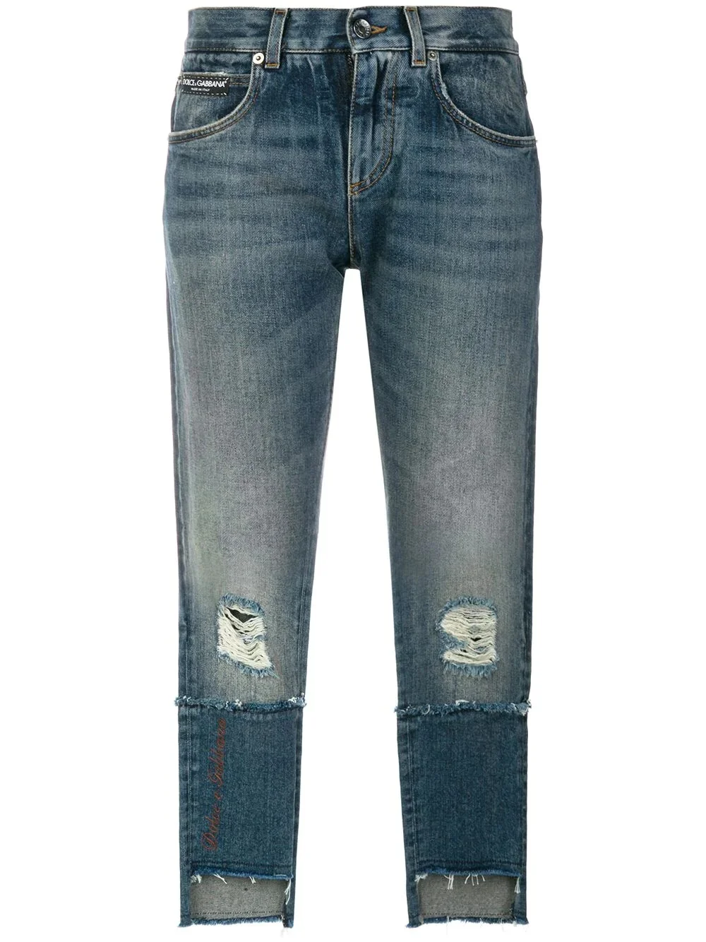 deconstructed logo patch jeans The Italian fashion house's signature luxury denim has been given a tougher edge for Spring Summer 2018 and these cropped distressed double denim jeans from Dolce & Gabbana are cool and casually chic. Crafted from a luxury faded dark blue cotton blend, these jeans feature a waistband with belt loops, a mid rise, a button and zip fly, a five pocket design, a skinny fit and a cropped length. These Dolce & Gabbana jeans are finished with a two tone double design alongside distressed effects and a high low hem to the cuffs. Made in Italy Composition Cotton 100%, Polyester 95%, Polyamide 5% SIZE & FIT Model measurements Height 5 ft 9 in(1.76 m) Bust/Chest 35.03 in(89 cm) Hips 35.43 in(90 cm) Waist 24.01 in(61 cm) Washing instructions Hand Wash