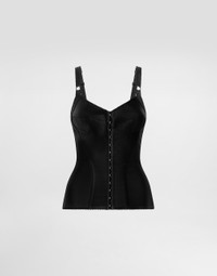 This elegant black bustier is perfect for adding a touch of sophistication to your wardrobe. Made with high-quality materials, it offers exceptional comfort and unmistakable style. Elastic satin bustier top: •Black • The model is 175 cm tall and wears size 40 IT • Made in Italy External Composition: 51% Polyamide, 35% Polyester, 9% Elastane, 5% Silk Internal Composition: 100% Cotton