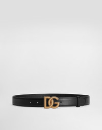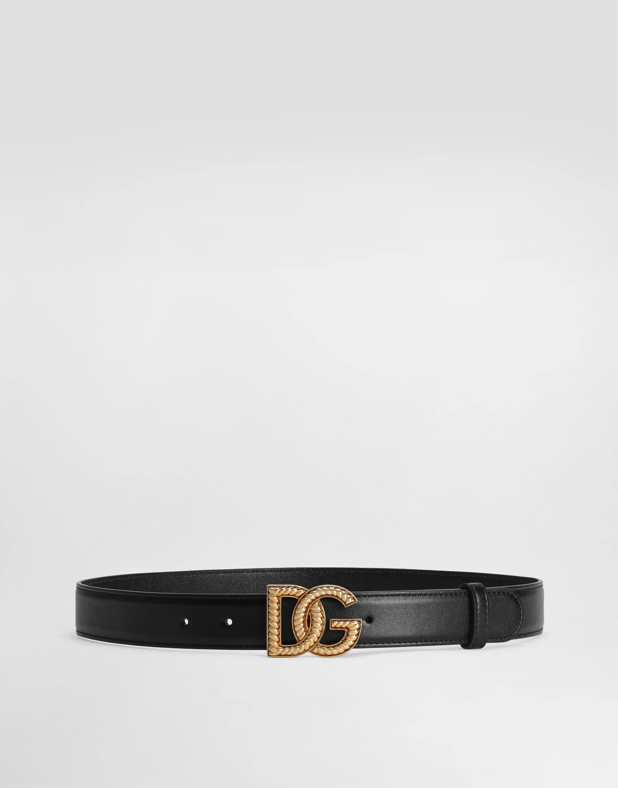 This calfskin logo belt is an elegant and sophisticated accessory, perfect for adding a touch of class to your outfit. Calfskin belt with DG logo: • Black • The belt strap is 3 cm in height • DG crossed buckle with torchon inserts • Vintage brass plating • Internal customization with fire stamp • Item equipped with logo bag and a logoed box • Made in Italy External Composition: 100% Calfskin Internal Composition: 100% Calfskin This product is made with leather from tanneries certified according to environmental standards.