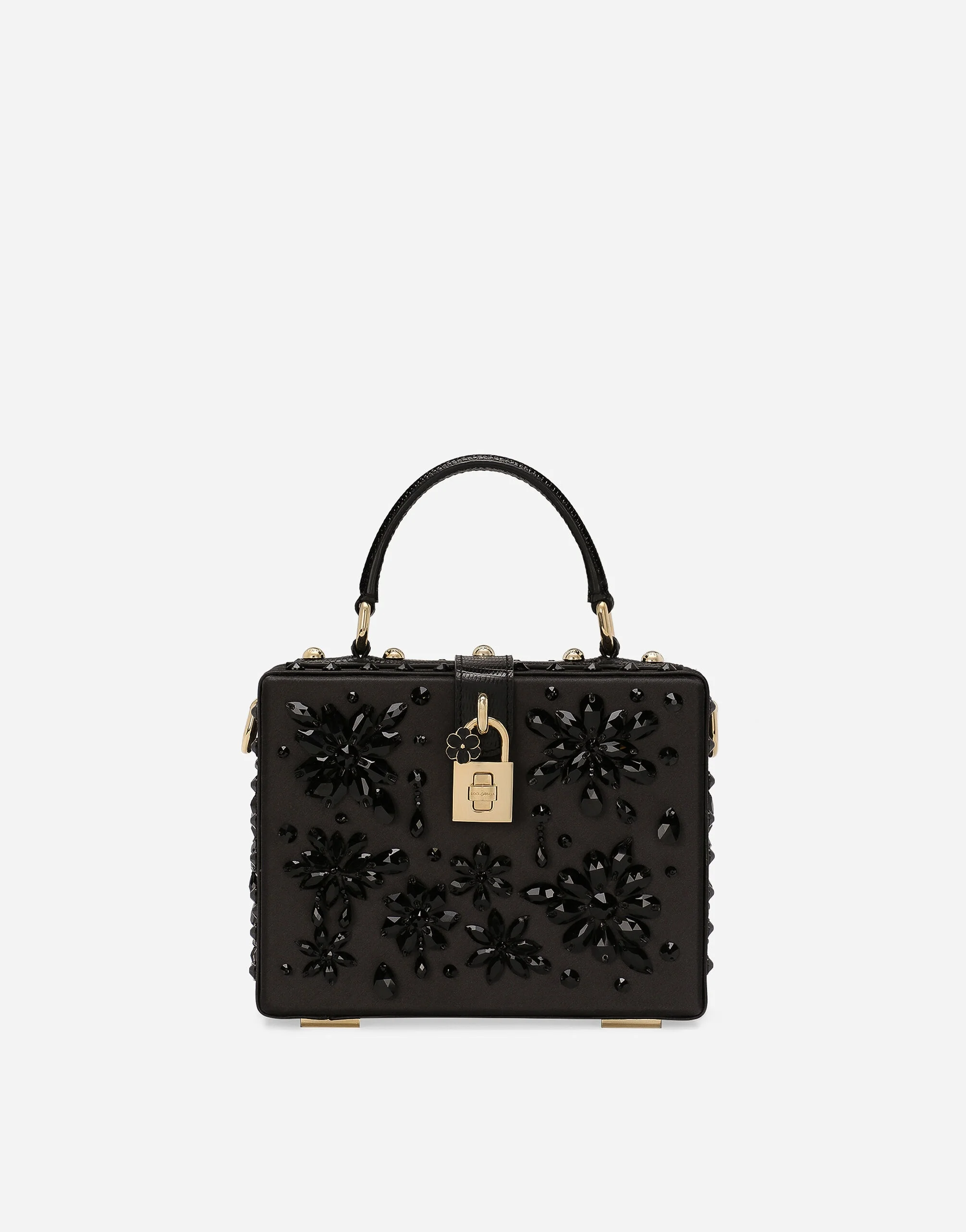 The Dolce Box bag embodies the brand’s craftsmanship, love and attention to detail. Elegant and unique, it comes in satin with gemstone embellishment. Satin Dolce Box bag with embroidery: • Black • Fastening with enameled flower embellishment and padlock • Top handle and adjustable, detachable strap in iguana-print calfskin • Calfskin lining • Inner pocket with concealed magnetic fastening and a card slot fastening • Item comes with a branded dust bag • Measurements: H14.5 x W19 x D7 cm • Made in Italy External composition: 58% Viscose 22% Silk 20% Calfskin Internal composition: 95% Calfskin 5% Poplar Plywood