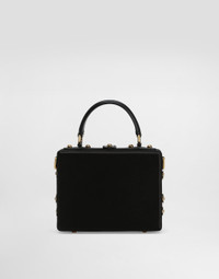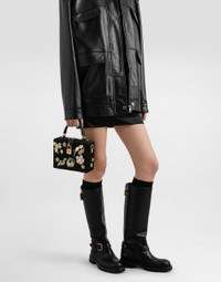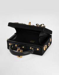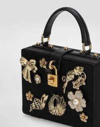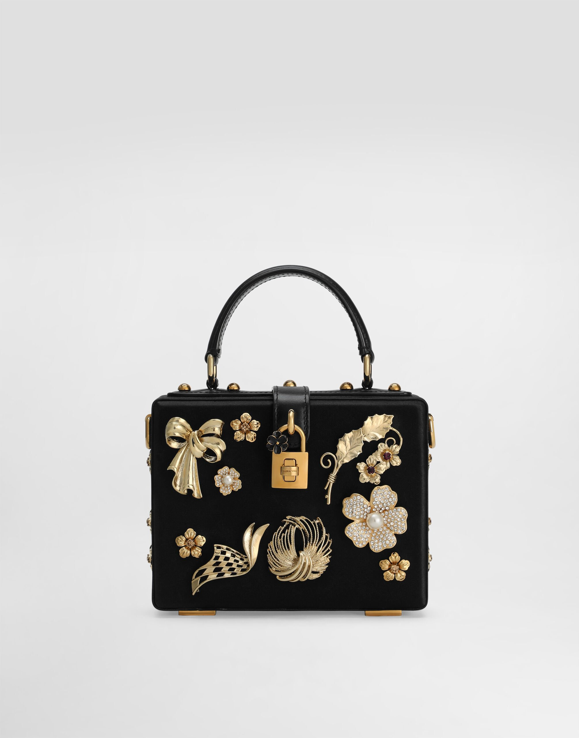 The Dolce Box handbag is a refined accessory that combines elegance and functionality. Made of satin and calfskin, it is enriched with embroidery with decorative elements and rhinestones, perfect for adding a touch of luxury to any outfit. Dolce Box handbag in satin and calfskin: • Black • Leather handles and removable and adjustable shoulder strap • Padlock and swivel closure • Vintage brass plating • External customization with padlock and enameled flower • Interior with logo tag, card pocket and pocket with flap and magnet • Item equipped with a logo bag and a pre-assembled box • Measurements: H14.5 x W19 x D7 cm • Can hold keys, card holder and phone. • Made in Italy External Composition: 55% Viscose, 20% Silk, 20% Calfskin, 5% Poplar Plywood