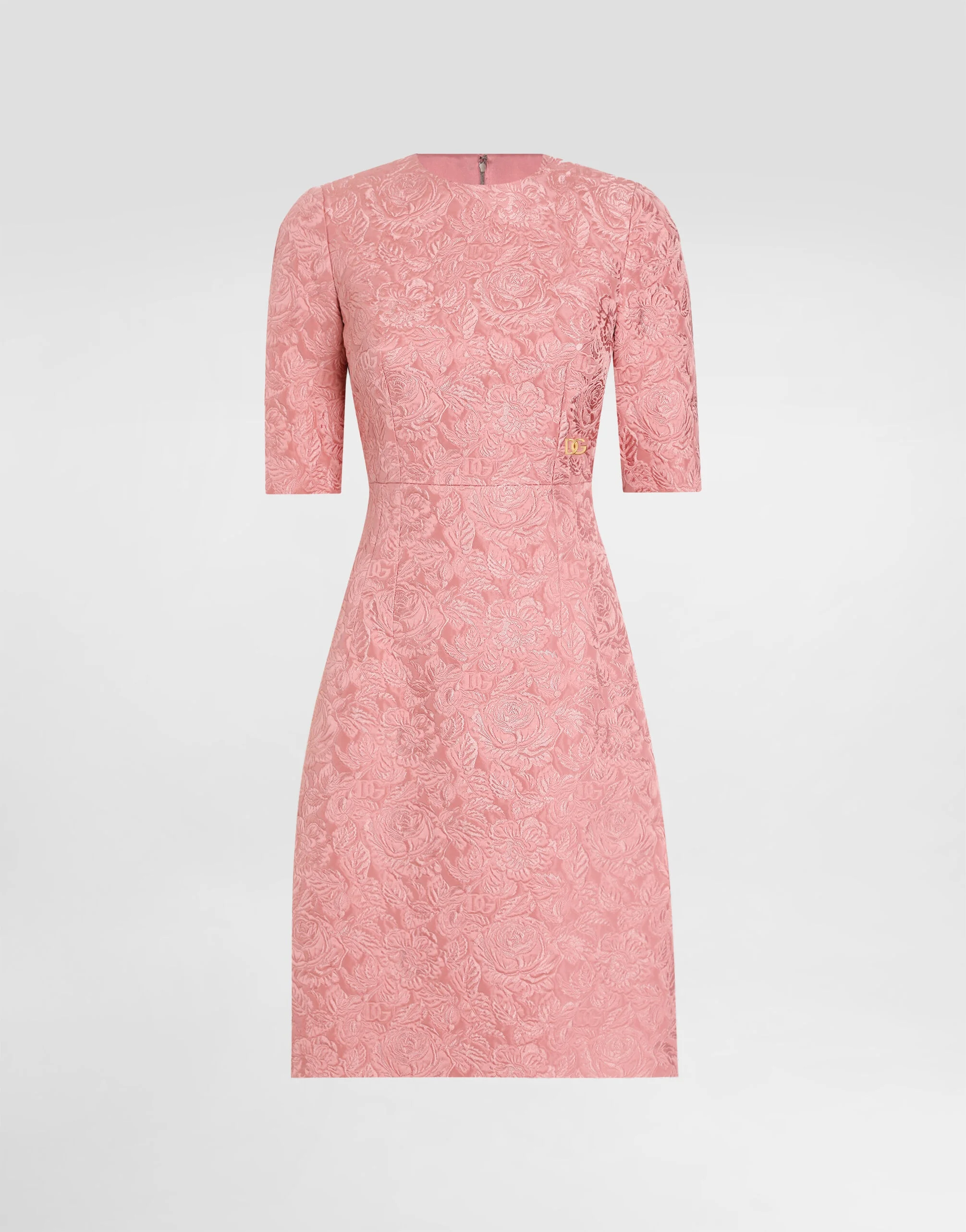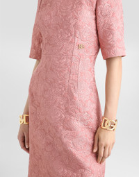 The Women’s DNA Collection is introducing a new side to femininity, which comes in shades of rose quartz, poised between sheerness and opacity, lightness and structure, formality and sensuality. Geometric Dolce Jackets, jacquard pajamas and floral brocade dresses intertwine with ultra-romantic designs. The DG print becomes an iconic statement, while Cordonetto lace and hints of Sicily Black embody the essence of a determined yet romantic femininity. Fit-and-flare midi dress in floral quilted jacquard with the DG logo: • Pink • Round neckline • Short sleeves • Empire body • Tonal stretch silk satin lining • Rear zipper and hook-and-eye fastening • The piece measures 96 cm from the back of the neck on a size IT 40 • The model is 175 cm tall and wears a size IT 40 • Made in Italy External composition: 49% Cotton 32% Polyester 19% Silk Internal composition: 92% Silk 08% Spandex