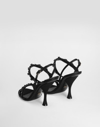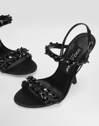 In the Fall/Winter 2025 Fashion Show Collection, shearling jackets, in fur-free versions, reveal slip dresses and create contrast' plays while denim welcomes fabric or Leo print inserts. Sweatshirts are the result of long experimentation with volumes. Evening looks become precious thanks to dresses with special embroideries and luminous touches of sequins and crystals. Sheepskin inserts also unite hats, shoes, and bags, including those with pockets. This sandal is a perfect example of elegance and craftsmanship, combining the luxury of satin with the brilliance of rhinestones for a sophisticated and modern look. Satin sandal with rhinestone embroidery: • Multi-colored • Keira 2.0 shape • Leather outsole with metal DG detail • Leather open toe insole • Insole customization with label • Customization with DG crossed logo • Miami palladium plating • Item equipped with black Cotton bag and black embossed box • Heel height 105 mm • Made in Italy External Composition: 74% Viscose, 25% Silk, 1% Lambskin Internal Composition: 68% Goatskin, 23% Viscose, 9% Silk