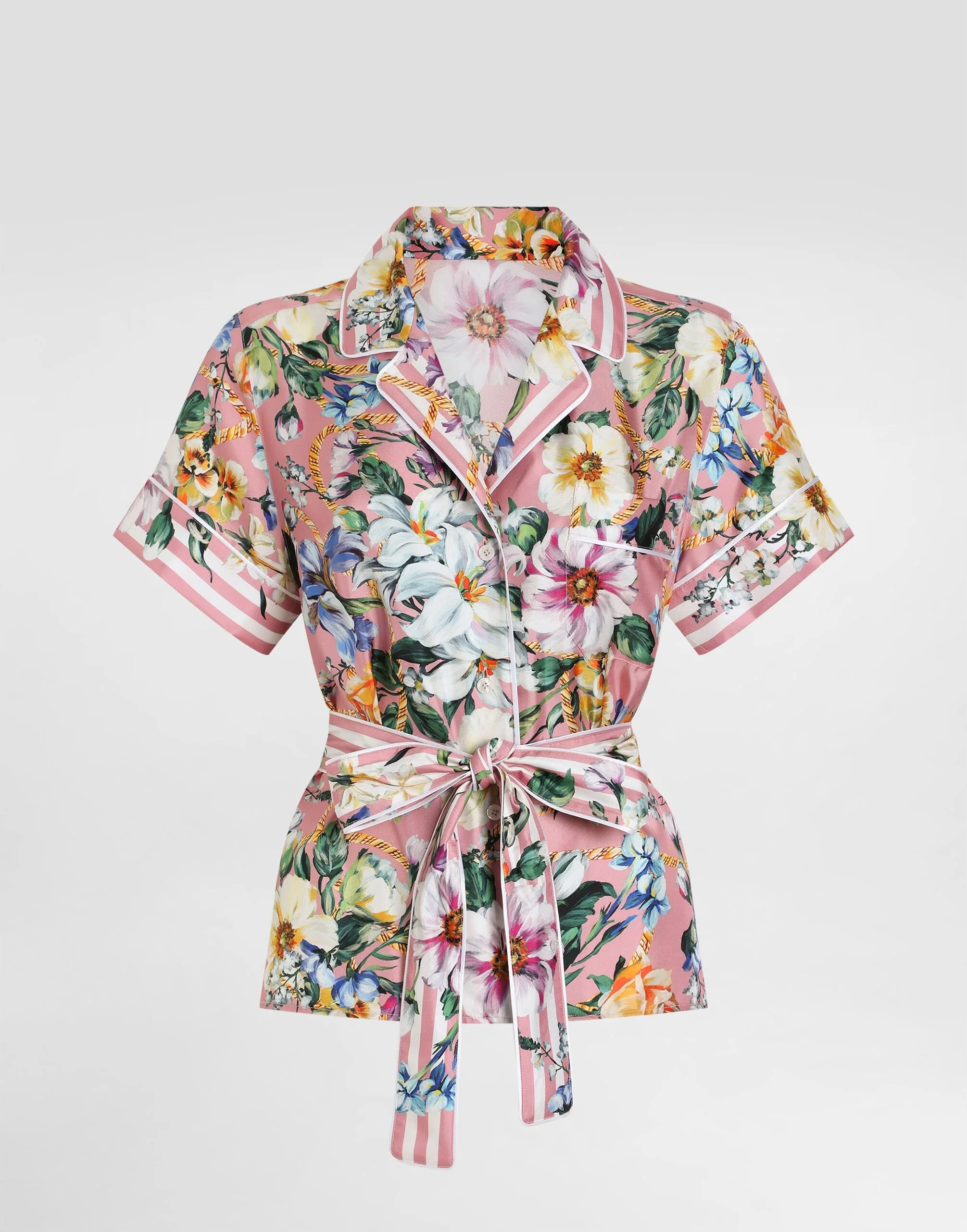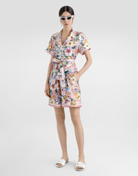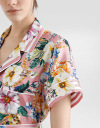 The Spring/Summer 2025 Warm Weather Collection is a vibrant ode to the beauty of the floral world, celebrating the elegance and vitality that lie at the heart of the brand’s DNA. Delicate, colorful bouquets dance across light dresses, skirts, trousers, and beachwear, infusing each piece with a sense of romance and freshness. Coordinated accessories, from scarves to headbands, add charm. An explosion of color and blooms, this collection captures the brand’s unmistakable spirit. Silk twill pajama shirt with floral print: • Multi-colored • Notched lapel collar • Short sleeves • Regular fit • Button fastenings with branded bottom edge and silk twill belt • The piece measures 60 cm from the back of the neck on a size IT 40 • The model is 175 cm tall and wears a size IT 40 • Made in Italy The difference in the print placement that you may find on this product is a feature of Dolce&Gabbana’s “Handmade” pieces. A detail that makes every garment or accessory unique and exclusive. External composition: 100% Silk
