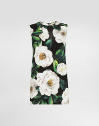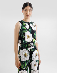 The Women's Black Sicily Collection reinforces Dolce&Gabbana's iconic fabrics and codes rooted in Italian heritage. Sensual silhouettes, highlighted by floral prints and refined corsetry, evoke an intriguing elegance, while the iconic black lace, satin, and velvet dominate the collection. Denim in various shades of blue introduces a contemporary twist, balancing the classic and modern. Embroidered crosses, medals, and jewelry add a sophisticated touch. Sleeveless stretch silk charmeuse top with gardenia print: • Multi-colored • Round neck • Sleeveless • Regular fit • Unlined • The piece measures 62 cm from the center back on a size IT 40 • The model is 175 cm tall and wears a size IT 40 • Made in Italy External composition: 94% Silk 06% Spandex