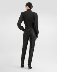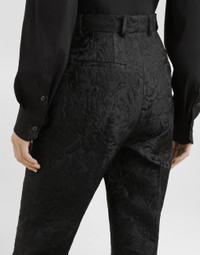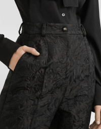 These classic trousers are a must-have for any stylish wardrobe. Made of brocade with a sophisticated peony print, they offer a touch of class and sophistication. Peony-motif brocade trousers: • Black • Cigarette line • Dolce waist • Center back length 74 cm on size 40 IT • The model is 175 cm tall and wears size 40 IT • Made in Italy External Composition: 49% Cotton, 32% Polyester, 19% Silk
