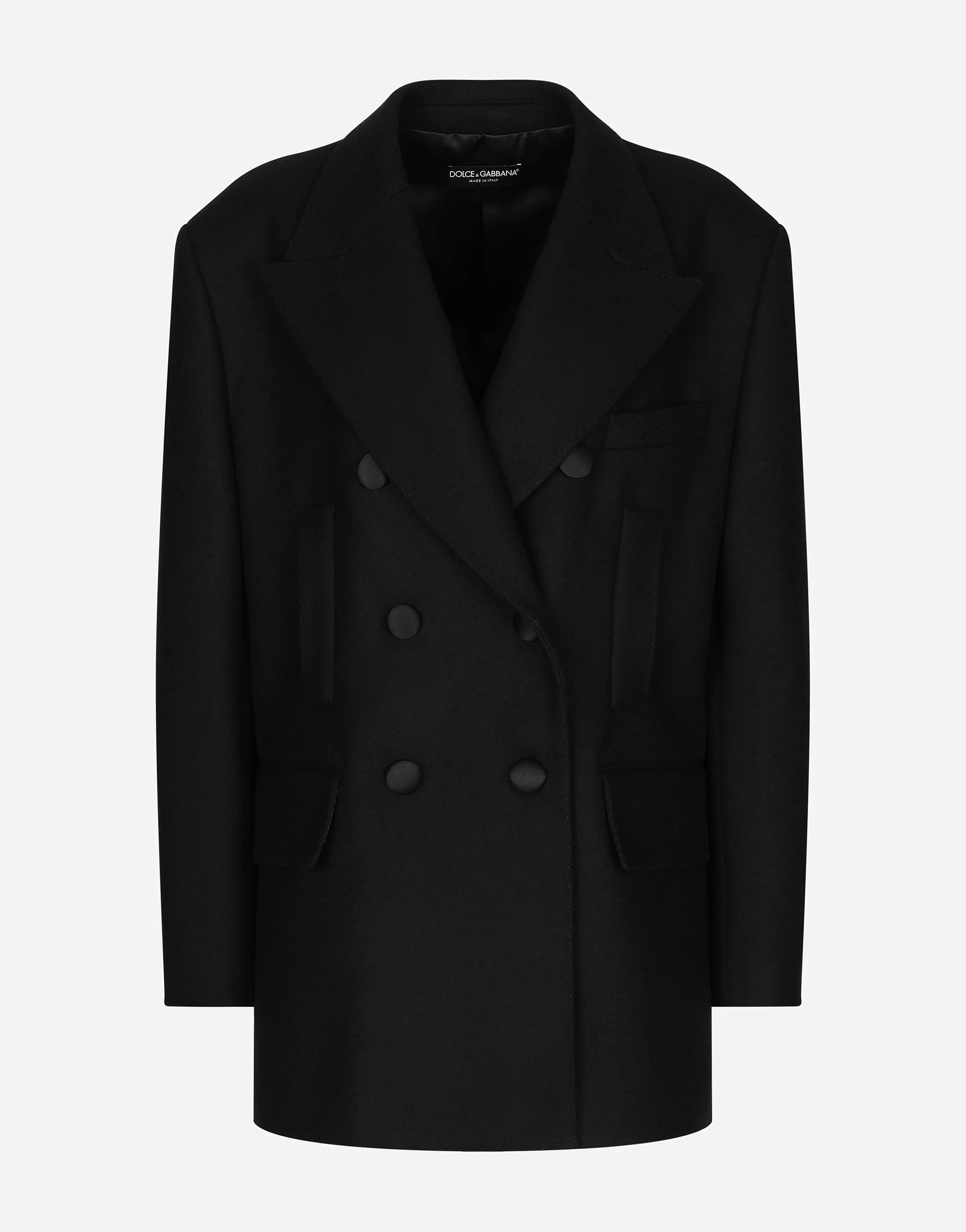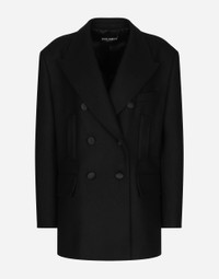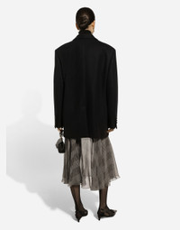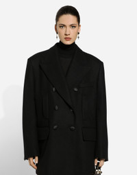 Inspired by 80s fashion photography, the Black Sicily collection masterfully blends masculine and feminine elements, pairing tailored cuts and corset details for the FW 24/25 season. A new vision of the iconic Nero Sicilia black is conveyed through contemporary and sensual looks: jackets and skirts in all-over glen plaid pair with openwork socks, while the 50s-inspired Mun shoes with Eva heel go with the houndstooth Sicily bag featuring crocodile-print leather inserts. Oversize double-breasted wool baize jacket: • Black • Peak lapels • Long sleeves • Flap pockets • Silk satin lining • Satin-covered button fastening • The piece measures 79 cm from the rear collar seam on a size IT 40 • The model is 175 cm tall and wears a size IT 40 • Made in Italy External composition: 80% Virgin Wool 20% Polyamide Internal composition: 100% Silk