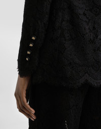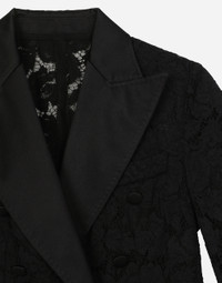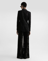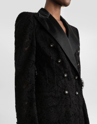 In the FW 24/25 DNA Collection, the rules of classic tailoring have been reworked with an innovative feel. New raschel weave techniques feature on micro-jackets and coats, and original textures are woven on trench coats, skirts, jacquard suits and shirts. The color palette made up of Nero Sicilia black, Milky White and Ocean Blue is also original. The iconic bags in fine nappa leather and “Pyton FC Machine” finish off the looks. Branded floral cordonetto lace Turlington jacket: • Black • Silk satin peak lapels • Long sleeves • Silk satin flap pockets • Tulle lining • Cannete-covered button fastenings and DG logo • The piece measures 70.5 cm from the rear collar seam on a size IT 40 • The model is 175 cm tall and wears a size IT 40 • Made in Italy External composition: 32% Viscose 28% Cotton 20% Polyamide 16% Silk 4% Polyester Internal composition: 90% Polyamide 10% Silk