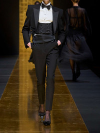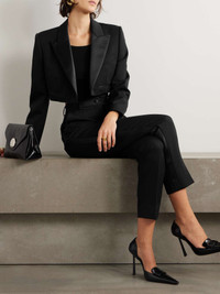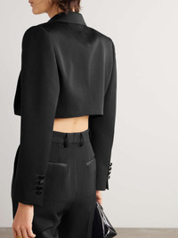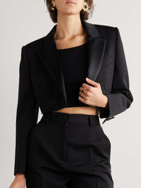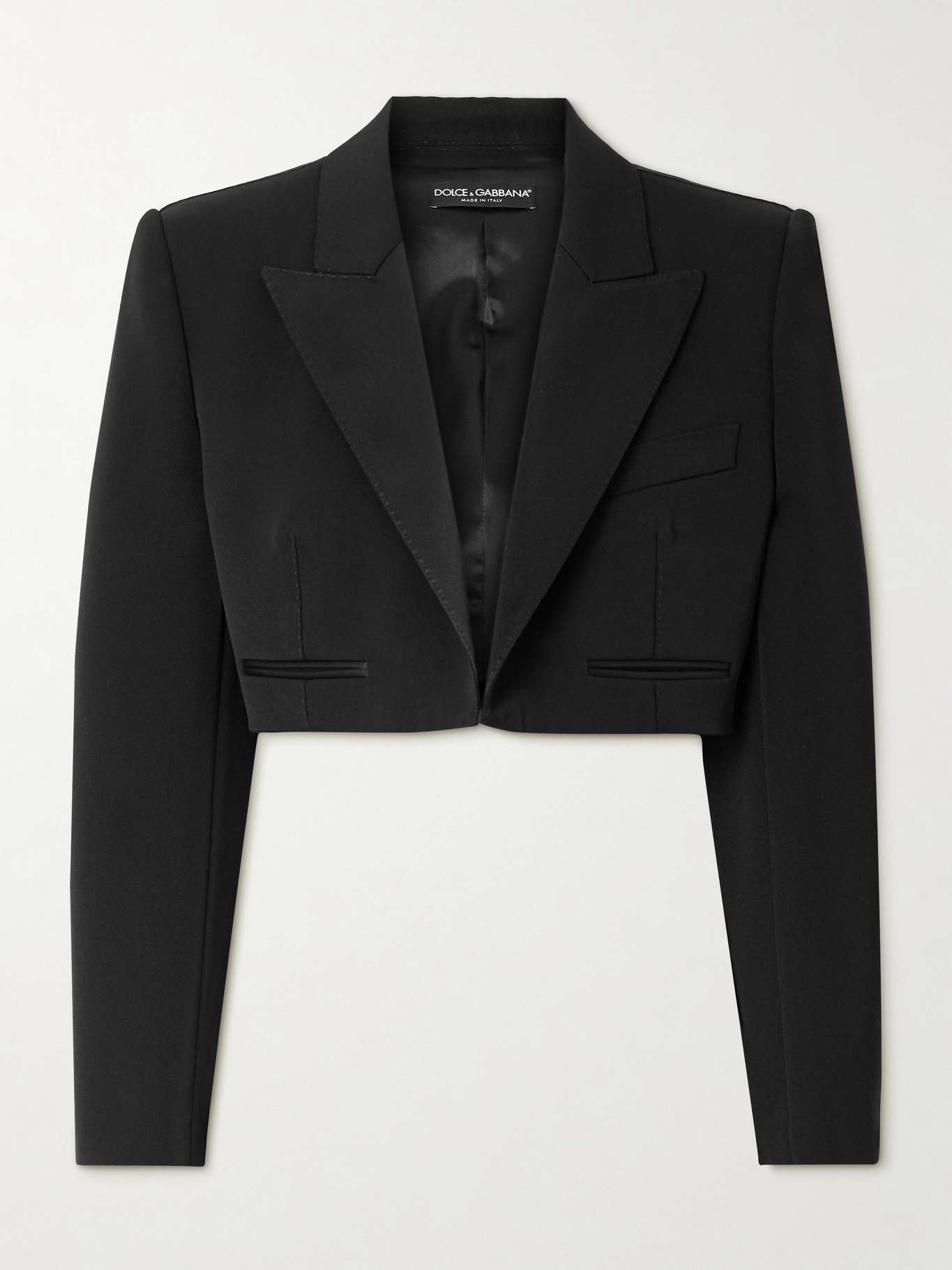 Dolce&Gabbana's Fall '24 collection reimagines the classic tuxedo through a modern, feminine lens. Featured on the runway, this blazer is cut from wool-blend gabardine in a cropped fit with boxy, padded shoulders and traditional satin peak lapels. Style yours over a lace top. Details & Care - Black wool-blend gabardine and satin - Slips on - 85% virgin wool, 12% silk, 3% polyester - Dry clean