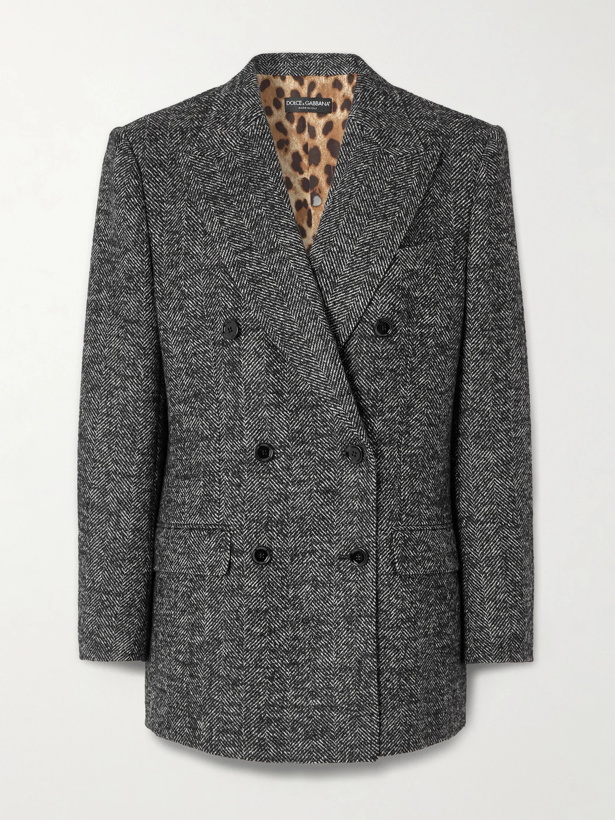 Dolce & Gabbana's blazer is reminiscent of vintage tailoring, evoking timeless sophistication. It's made from herringbone wool-blend in a melange of tonal-gray and white threads and has a slightly loose, double-breasted design with peak lapels that draw the eye to the padded shoulders. Cinch the waist with a leather belt and style it with the coordinating skirt in our edit.