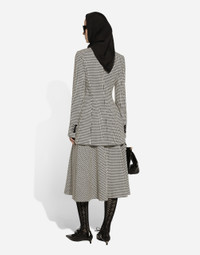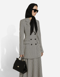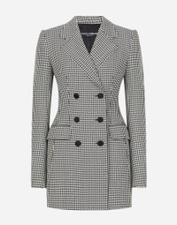 Inspired by 80s fashion photography, the Black Sicily collection masterfully blends masculine and feminine elements, pairing tailored cuts and corset details for the FW 24/25 season. A new vision of the iconic Nero Sicilia black is conveyed through contemporary and sensual looks: jackets and skirts in all-over glen plaid pair with openwork socks, while the 50s-inspired Mun shoes with Eva heel go with the houndstooth Sicily bag featuring crocodile-print leather inserts. Double-breasted wool houndstooth jacket: • Gray • Notched lapels • Long sleeves • Flap pockets • Silk satin lining • Satin-covered button fastenings • The piece measures 77 cm from the center back on a size IT 40 • The model is 175 cm tall and wears a size IT 40 • Made in Italy External composition: 55% Virgin Wool 45% Viscose Internal composition: 100% Silk
