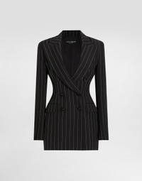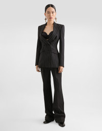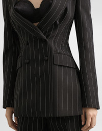 The Spring/Summer 2025 Women’s Collection is celebrating Italian beauty through bold and charismatic femininity. The 50s-inspired lingerie is the star, intermingling with fitted dresses, corsets and oversize trench coats. The iconic jackets have been updated with cropped cuts and modern inserts, while the floral prints add a romantic edge. The eveningwear shines with light fabrics and crystals, accompanied by look-defining accessories, from iconic bags to the cross earrings. Double-breasted pinstripe wool jacket: • Striped • Peak lapels • Long sleeves • Flap pockets • Stretch silk satin lining • Button fastenings • The piece measures 75 cm from the center back on a size IT 40 • The model is 175 cm tall and wears a size IT 40 • Made in Italy External composition: 98% Virgin Wool 2% Polyester Internal composition: 92% Silk 08% Spandex