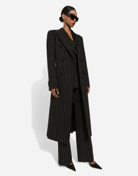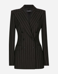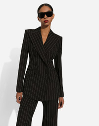 In the Black Sicily Collection, black, the absolute protagonist, becomes sensual black, sheer black, Dolce&Gabbana black. The key concept is “Black on Black”. Playing around with proportions, volumes, layered fabrics and sheer details, this style becomes absolute, bold and sexy. Unique and unmistakable, it is conveyed through the contrasts between glossy and matte fabrics, lines, volumes and special details, thereby expressing a woman’s various personalities and the true identity of Dolce&Gabbana. Double-breasted pinstripe wool Turlington jacket: • Black • Peak lapels • Long sleeves • Flap pockets • Stretch silk satin lining • Covered button fastenings • The piece measures 71 cm from the center back on a size IT 40 • The model is 175 cm tall and wears a size IT 40 • Made in Italy External composition: 100% Virgin Wool Internal composition: 92% Silk 8% Spandex