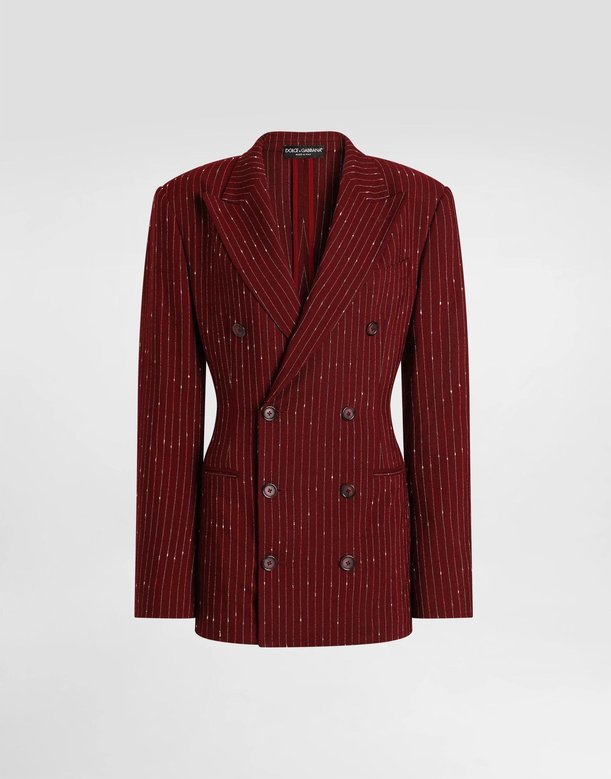 The SS26 Women's Fashion Show Collection is the result of a play of harmonious contrasts: masculine and feminine, day and evening, tailored and casual. Pyjamas take centre stage, paired with lingerie and formal garments. The play of layers and the mix of different influences contribute to expressing the relaxed attitude and unique, original style at the heart of the collection. This double-breasted jacket is an example of timeless elegance, perfect for the modern woman who appreciates the classic touch of pinstripe fabric. With an enlarged lapel and unlined construction, it fits perfectly for any occasion, from the most formal to the most casual. Double-breasted jacket with pinstripe print: • Multi-colored • Taormina shape • Enlarged lapels • With buttons • Structured, unlined • The model is 175 cm tall and wears size 40 IT • Made in Italy External Composition: 97% Viscose, 2% Polyester, 1% Polyamide Internal Composition: 76% Acetate, 24% Silk