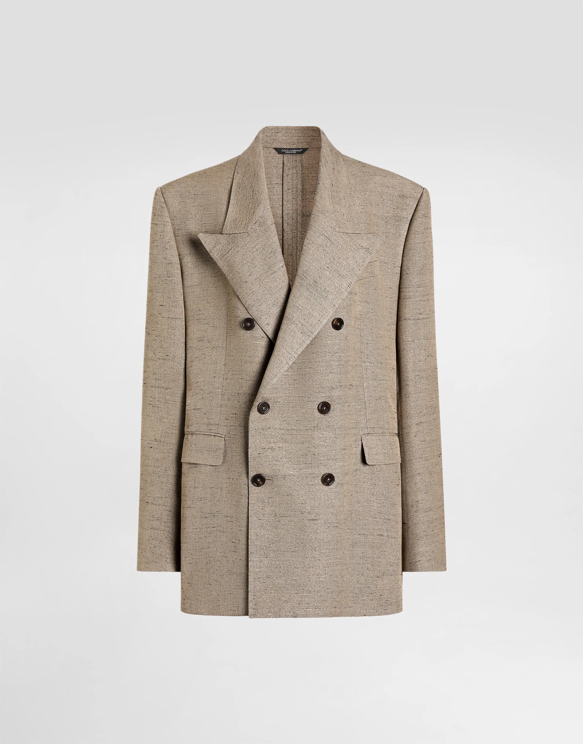 The SS26 Women's Fashion Show Collection is the result of a play of harmonious contrasts: masculine and feminine, day and evening, tailored and casual. Pyjamas take centre stage, paired with lingerie and formal garments. The play of layers and the mix of different influences contribute to expressing the relaxed attitude and unique, original style at the heart of the collection. This jacket represents a perfect balance between tradition and modernity, with a design that combines the classicism of tweed with a contemporary, oversized cut. Double-breasted tweed jacket: • Multi-colored • Sicily shape with strong chest and low shoulder • Very straight and pointed lapel • Double-breasted with 5 buttons • Semi-canvassed, unlined • The model is 175 cm tall and wears size 40 IT • Made in Italy Designed for an oversized fit. For a more fitted look, take one size down External Composition: 90% Viscose, 7% Linen, 3% Polyamide Internal Composition: 76% Acetate, 24% Silk