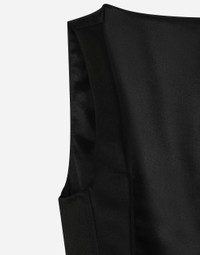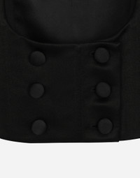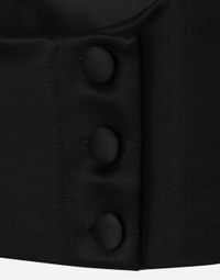 Menswear and womenswear mix and mingle, influencing one another and creating tailoring that embraces endless nuances, from the boldest to the most sophisticated, to define the rules of eternally classy femininity. A monochrome retelling in Nero Sicilia black, embellished by golden touches and rhinestones, adorning clean lines and incorporating stylish fabrics such as velvet, chiffon, lace, organza, and unique mesh details, the expression of authentic beauty for dresses, shirts and accessories. Double-breasted silk duchesse tuxedo jacket: • Black • Round neckline • Stretch silk satin lining • Covered button fastenings • The model is 175 cm tall and wears a size IT 40 • Made in Italy External composition: 95% Silk 05% Spandex Internal composition: 92% Silk 08% Spandex