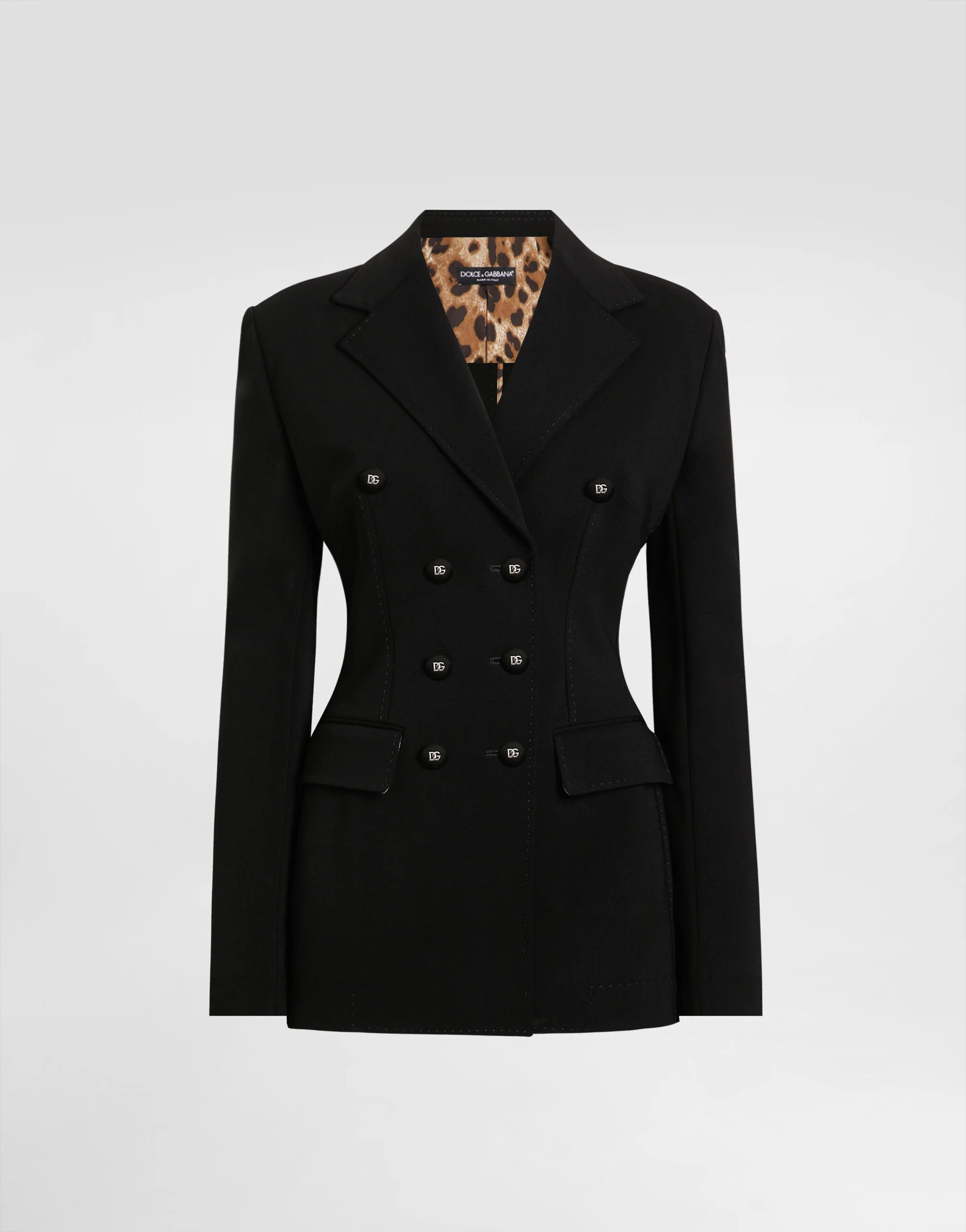 The DNA collection is distinguished by timeless shapes, bringing together three concepts: Sicilian flair, tailoring and sensuality. Nero Sicilia black and optical white predominate and pair with colors that catapult us onto the island of Sicily and make us dream. The designers channel the timeless wardrobe made up of creations that are instantly unmistakable in their simplicity, presenting us with sophisticated beauty loaded with meaning and symbolism that transcends fashion. Double-breasted Turlington jacket in stretch jersey Milano rib: • Black • Notched lapels • Long sleeves • Flap pockets • Partially lined • Canneté-covered button fastenings and DG logo • The piece measures 72 cm from the center back on a size IT 40 • The model is 175 cm tall and wears a size IT 40 • Made in Italy External composition: 65% Viscose 27% Polyamide 4% Spandex 3% Silk 1% Polyester Internal composition: 97% Polyester 3% Spandex