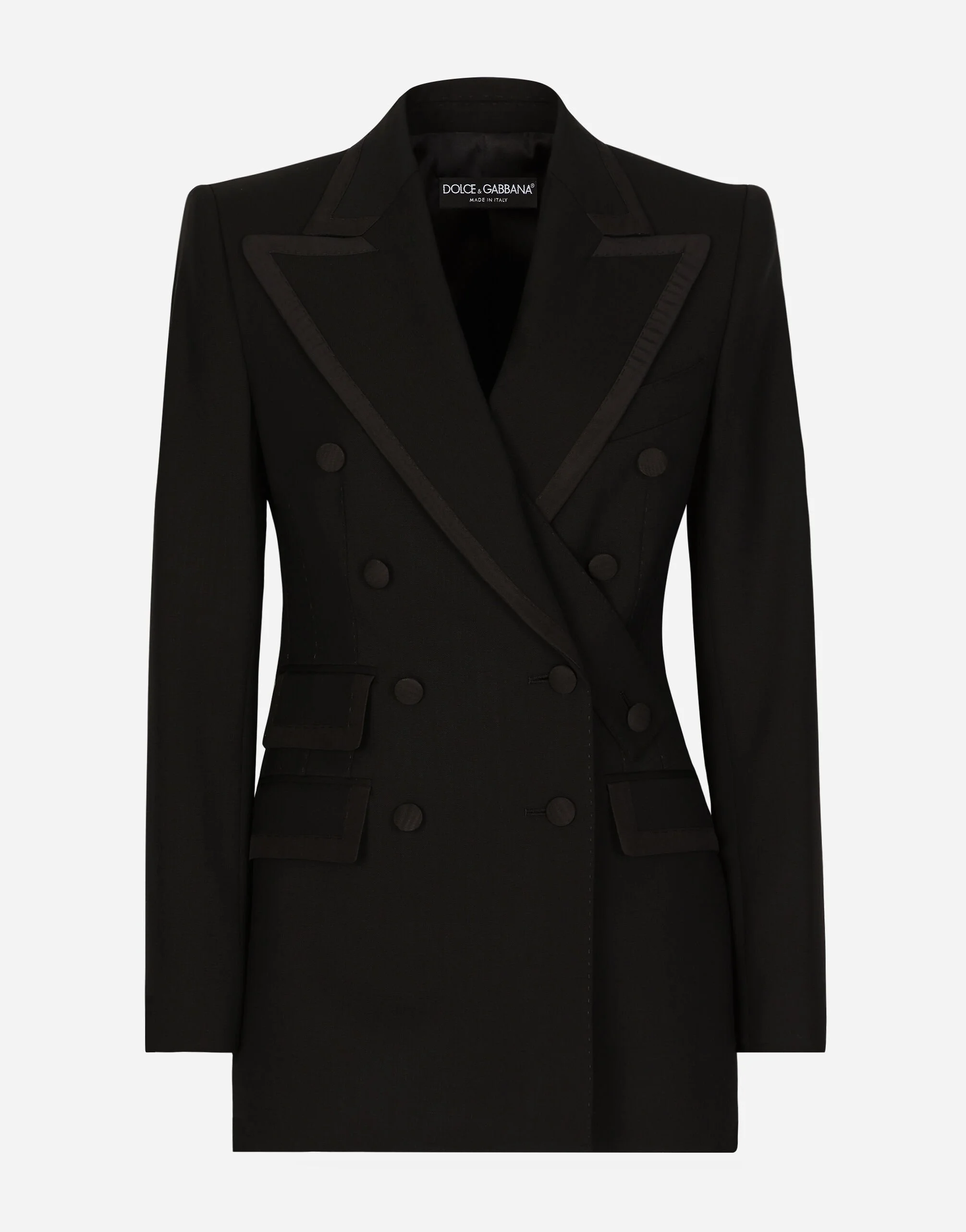 The DNA collection is distinguished by timeless shapes, bringing together three concepts: Sicilian flair, tailoring and sensuality. Nero Sicilia black and optical white predominate and pair with colors that catapult us onto the island of Sicily and make us dream. The designers channel the timeless wardrobe made up of creations that are instantly unmistakable in their simplicity, presenting us with sophisticated beauty loaded with meaning and symbolism that transcends fashion. Double-breasted stretch wool twill Turlington tuxedo jacket: • Black • Silk satin peak lapels • Long sleeves • Silk satin flap pockets • Side slits • Stretch silk satin lining • Canneté-covered button fastenings and DG logo • The piece measures 70 cm from the rear collar seam on a size IT 40 • The model is 175 cm tall and wears a size IT 40 • Made in Italy External composition: 89% Virgin Wool 7% Silk 4% Spandex Internal composition: 92% Silk 8% Spandex